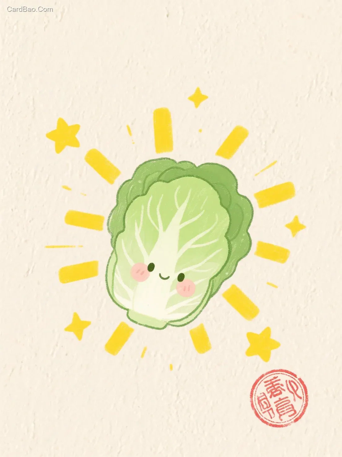 A small Chinese cabbage in the center of the image, surrounded by yellow glow and star decorations, set against a light beige textured background, with a red seal-style pattern in the bottom right corner. Cute, hand-drawn style.