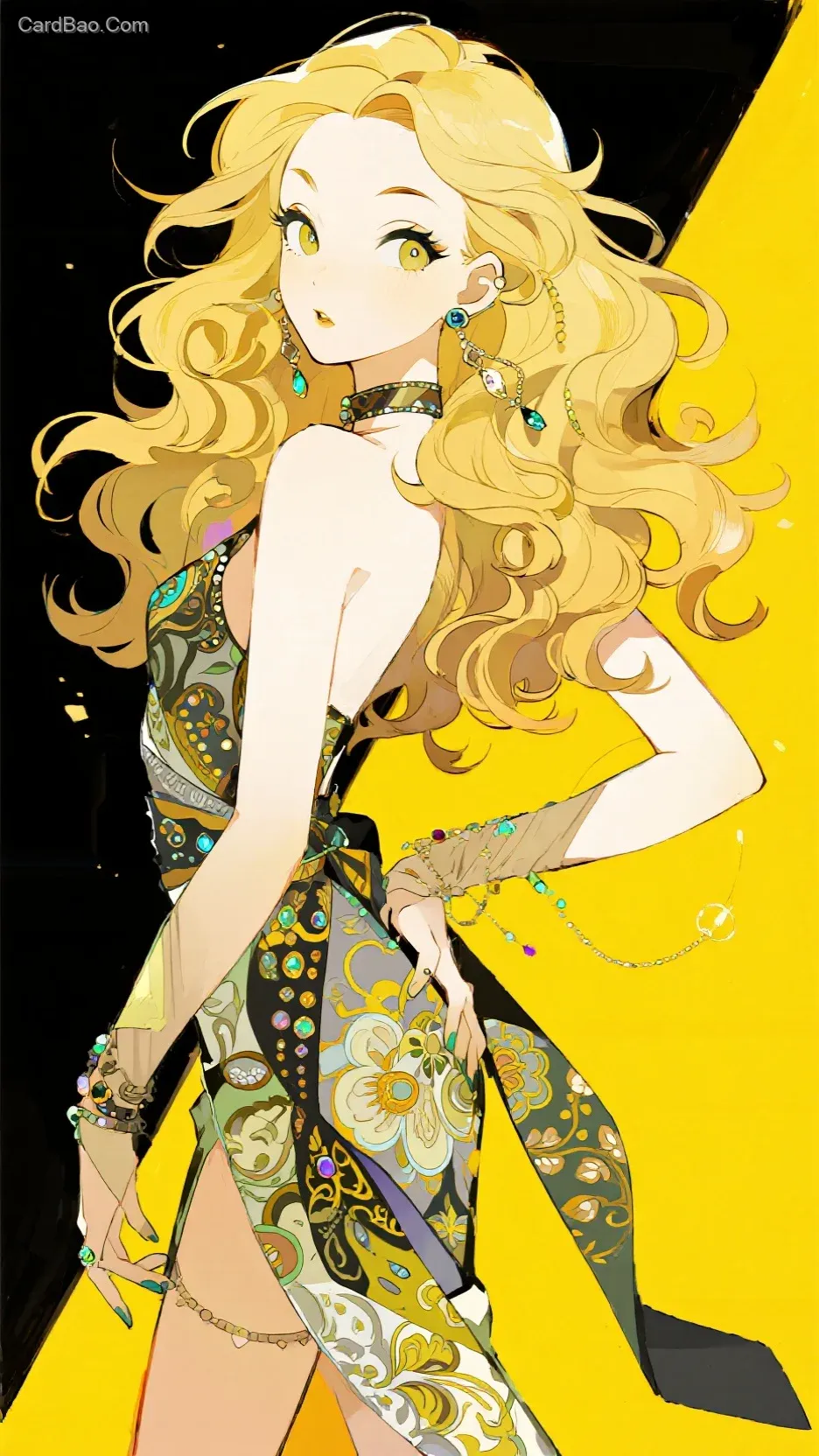 Cartoon illustration, main subject is a trendy long-haired beauty, full-body illustration, detailed full-body outfit details, close-up of facial features, strong visual impact, personality, distinctive characteristics, artistic sense, yellow background, hazy effect, high resolution, highly detailed