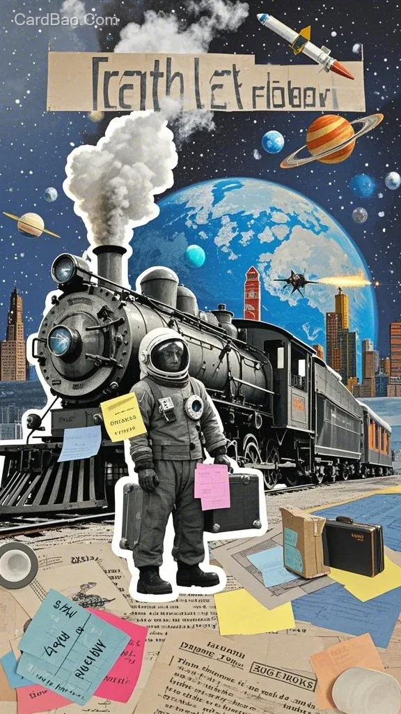 At the center of the image is a steam train, with a city and a large Earth in the background, accompanied by a starry sky and planets. A black-and-white collage-style astronaut holds a suitcase, newspaper, tape, stickers, and sticky notes, incorporating handwritten text, color and black-and-white elements, and colored cardstock. The piece features a vintage surrealist style combined with vintage collage, showcasing a collage of different textures and materials, vintage color tones, science fiction magazine clippings, as well as both flat and three-dimensional elements.
