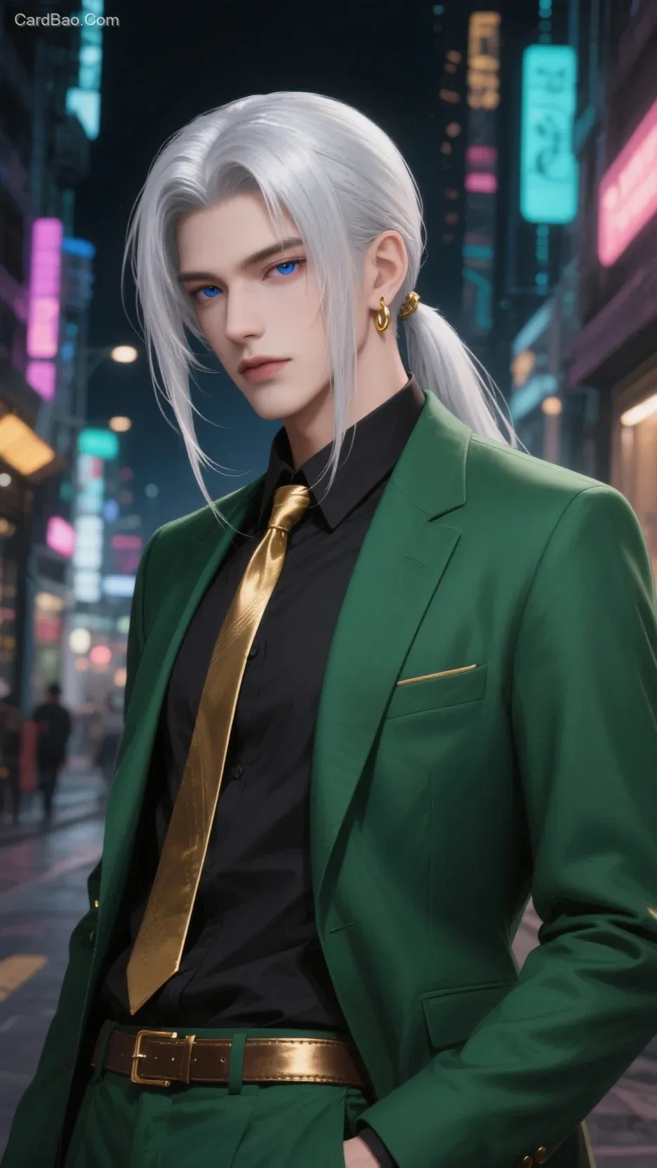 Young, mature male, handsome, with silver hair styled in a low ponytail, two long strands of bangs, center part, silver-white eyebrows, deep blue eyes, straight, smooth and neatly styled hair, and forehead bangs; wearing gold minimalist earrings, with tan skin. Dressed in a green suit, black shirt, gold tie, and luxurious belt. Background: cyberpunk-style street, night scene. Textured, 3D oil painting, CG rendering, 3D thick impasto, exquisitely detailed and glossy hair strands, long eyelashes, BJD, striking visual impact, facial close-up.