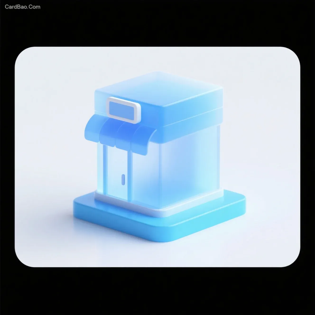 3D 渲染风格图标设计,毛玻璃风格,主体为浅蓝色渐变的商店,底部配置同色系方形基座。整体采用清新蓝调,通过柔和光影过渡塑造简洁现代的视觉氛围,背景白色,呈现光滑的塑料质感,突显灵动与精致感。使用 C4D 建模,OC 渲染器渲染,8K 分辨率,营造出干净且富有科技感的视觉效果