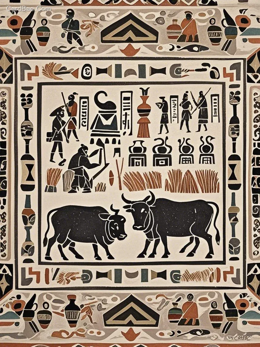 Han Dynasty stone reliefs, colored painting, painted pottery patterns, painted with black pigment, ancient China's Han Dynasty farming scene, plowing oxen, whip-wielding person, person hoeing the fields, harvesting, threshing wheat, tamping the threshing floor, winnowing