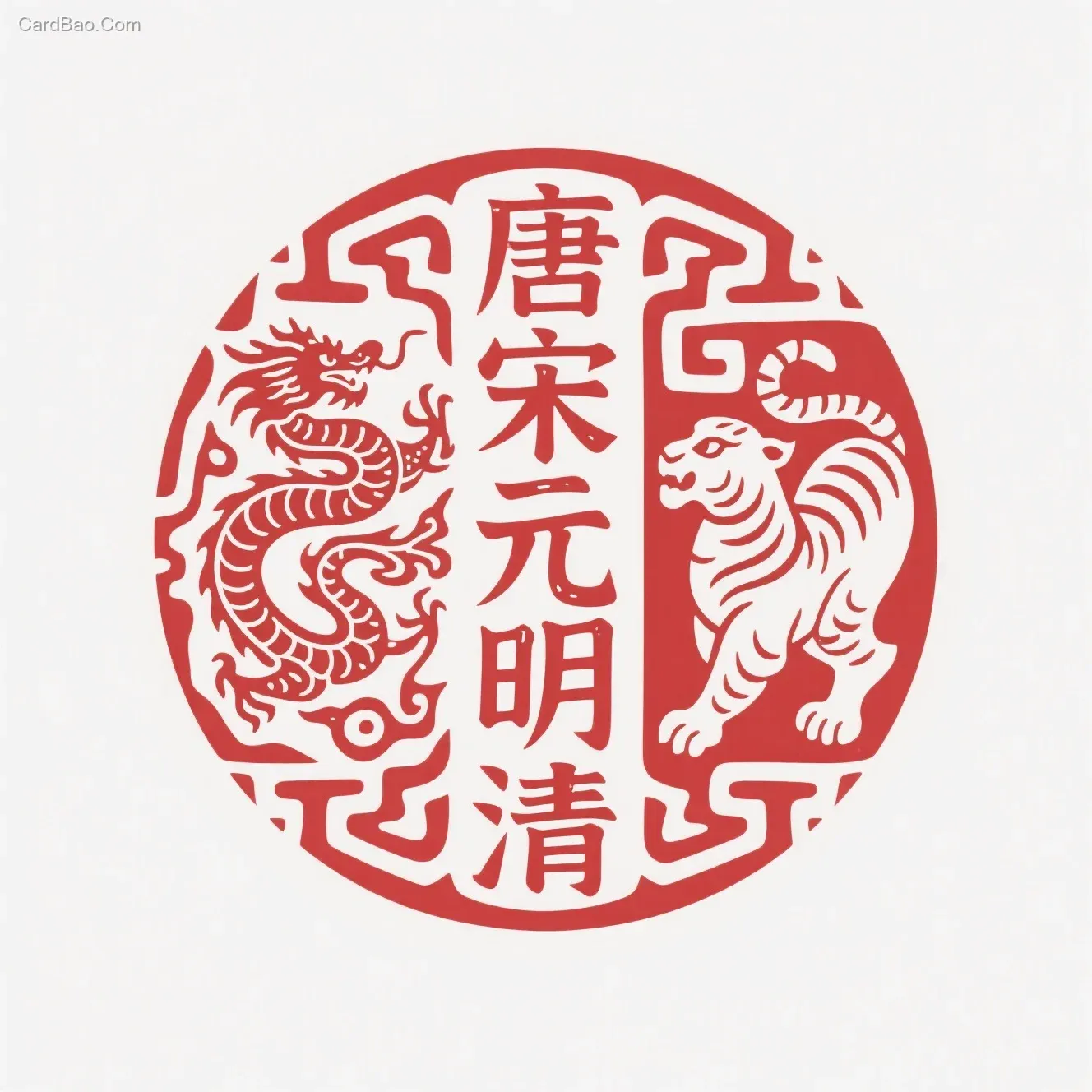 Circular seal inscribed with the characters "Tang, Song, Yuan, Ming, Qing" – featuring seal script and auspicious patterns composed solely in red, exuding an ancient, simple, and time-worn aura, set against a pure white background to highlight the complexity and exquisiteness of the seal characters. Flat design, emphasizing details and artistic composition structure. The characters are centered, with Azure Dragon on the left and White Tiger on the right.