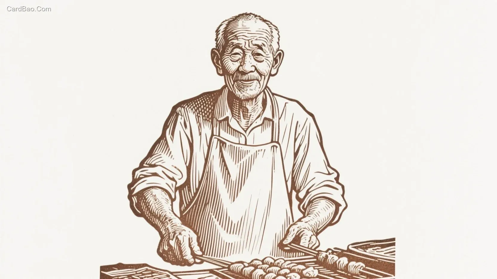 卖烧烤老头凹版印刷线稿,0.8mm粗线勾勒外轮廓,0.2mm细线刻画表面皮肤,保留铜版雕刻痕迹,纯白背景