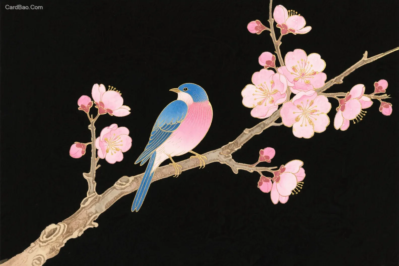简笔画,水彩,抽象的,梦幻的,海棠花枝,粉色花瓣,金边,一只蓝粉色国潮风格的鸟站在画枝上,树枝有1个分叉,工笔构图,大面积留白,黑色干净背景