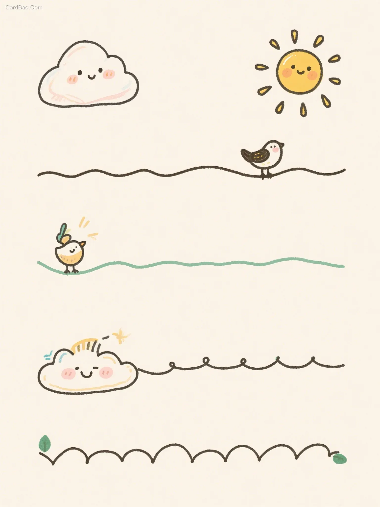 Hand-drawn dividing lines, five groups, hand-drawn lines, cartoon style, clouds, sun, birds, exquisite, detailed, light-colored background