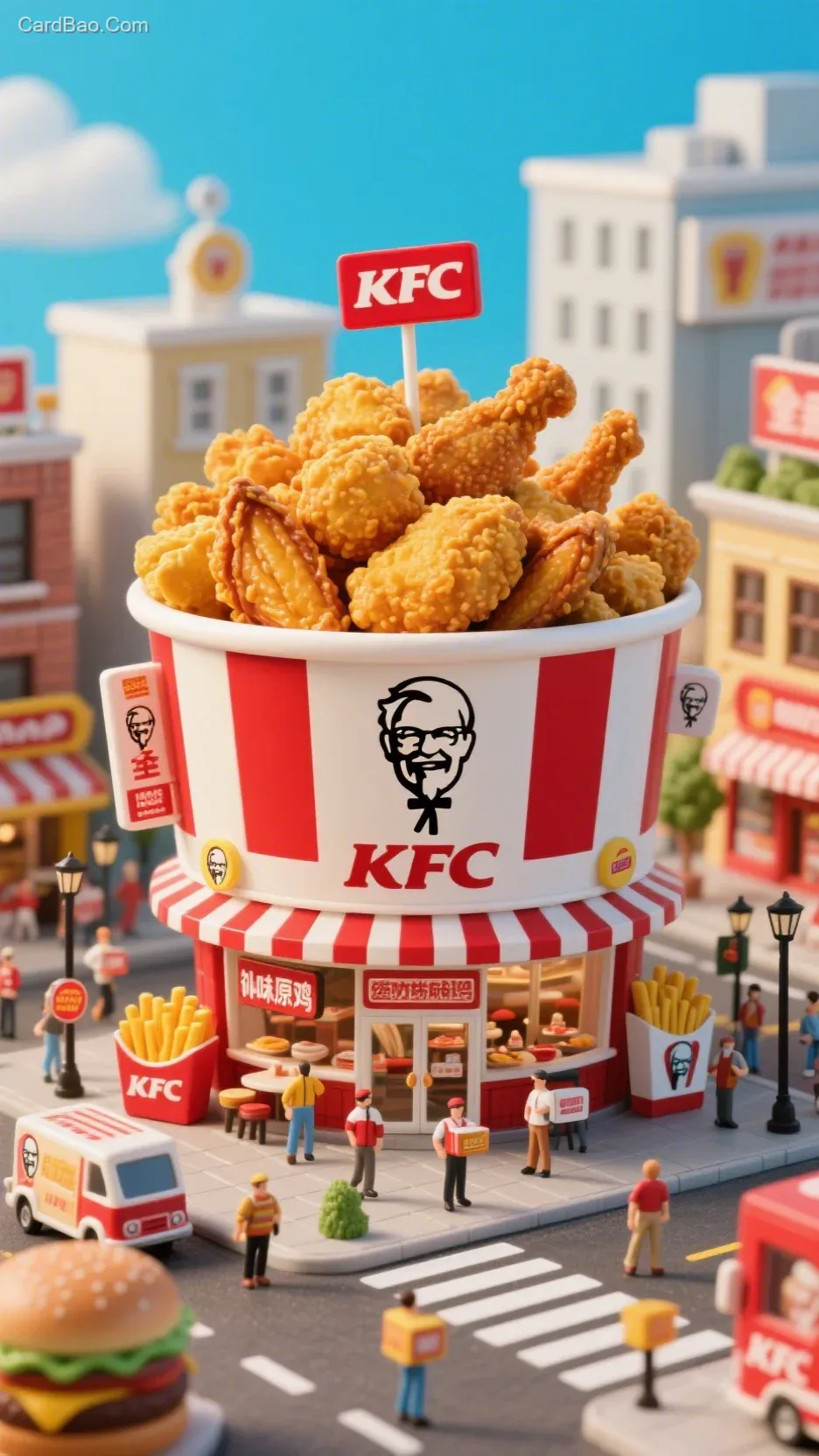 场景设定以微缩景观风格呈现肯德基店铺,构建一个卡通化的城市街景背景。画面中央是肯德基标志性红白配色的建筑,外形设计成超大号的肯德基全家桶样式,带有肯德基老爷爷头像和品牌标识。主体元素全家桶顶部堆满色泽金黄、外形诱人的炸鸡块和炸鸡翅,呈现出刚出锅的酥脆质感。桶顶插着肯德基红色品牌标识牌,周围搭配薯条盒、吮指原味鸡标牌等小元素。周边细节店铺周围有微缩的行人、外卖员等人物模型,营造热闹的用餐和外送氛围。附近布置有其他快餐元素,如汉堡模型、肯德基餐车等,强化快餐主题。建筑和街景细节丰富,包括道路、斑马线、路灯、周边店铺等,整体画面色彩鲜艳、饱和度高 。