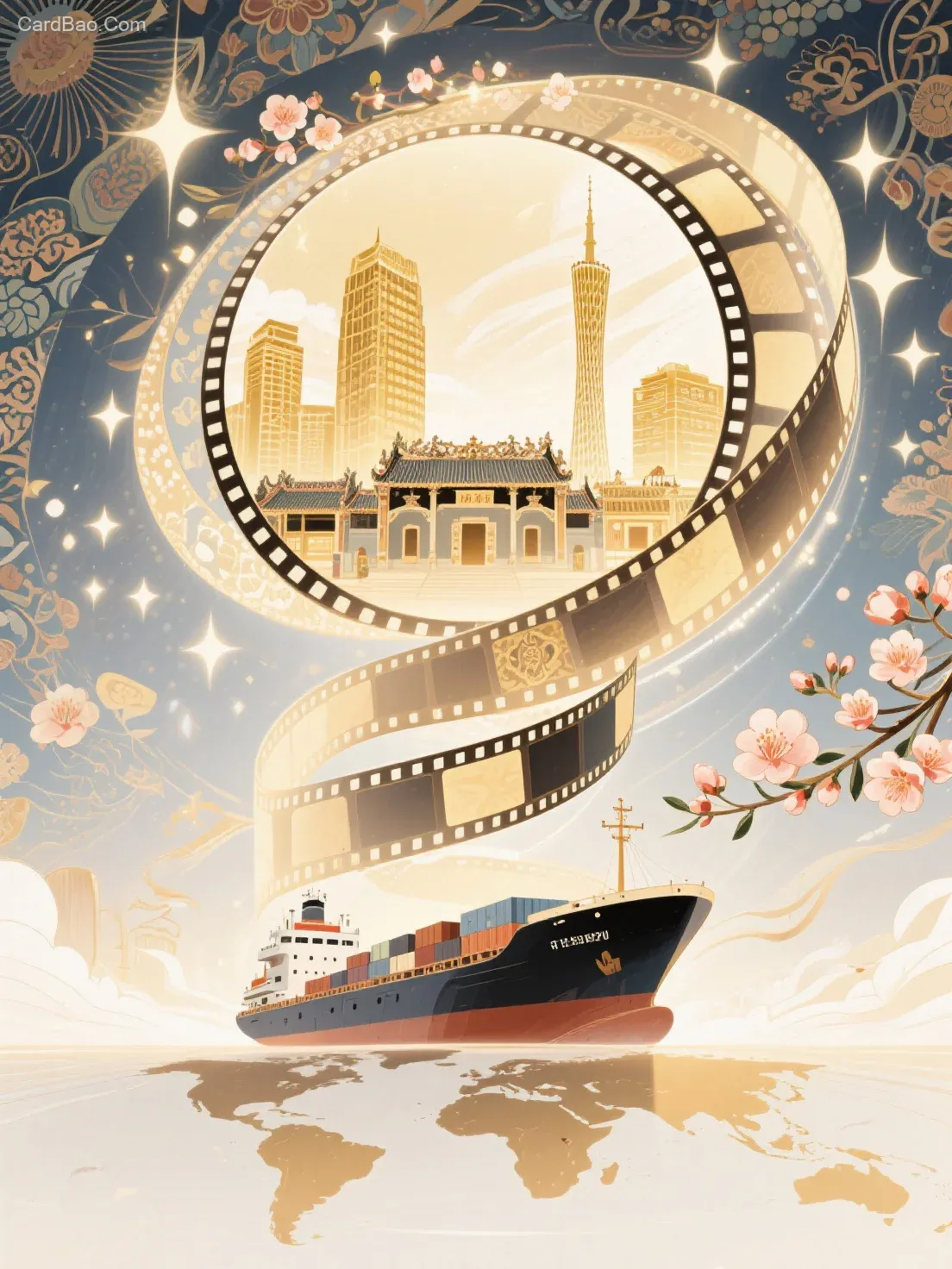 Creative illustration: The main subject is a movie film spiraling upward and encircling, with Guangzhou's renowned landmarks reflected within the film—such as the Canton Tower, Chen Clan Ancestral Hall, and Sun Yat-sen Memorial Hall. Surrounding this central element are cultural symbols including Lingnan-style patterns and kapok flower motifs. At the bottom of the composition, large cargo ships and a world map take center stage, fostering a dreamlike atmosphere infused with a sense of commercial and trade exchange. The image employs soft color tones, a clean palette, and partial negative space, with an overall style of fantastical and vibrant illustration. Dynamic effects depict star accents and flowing light and shadow; the interplay of light and shadow features a golden glow that mutually complements the starlight in the background, conveying a magnificent and exquisite visual atmosphere with powerful visual impact. High contrast, high definition, 32K, masterpiece, masterful color matching, masterful composition.