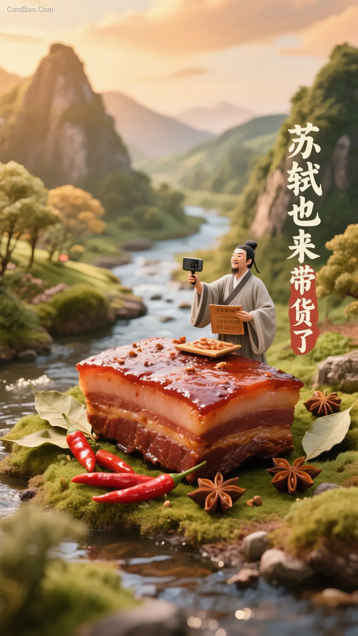 微缩景观,超大块红烧肉,辣椒,八角,一个小小的古装文人在直播叫卖,辣椒八角香叶做成的山水田园,意境优美,超高清,梦幻。“苏轼也来带货了”