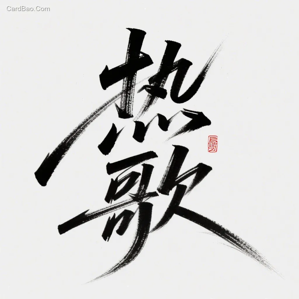 字体设计,热歌,要求马克笔手写风格,笔画特征需要由粗到细设计,增加水墨笔刷效果,笔画巧妙延长设计变形,