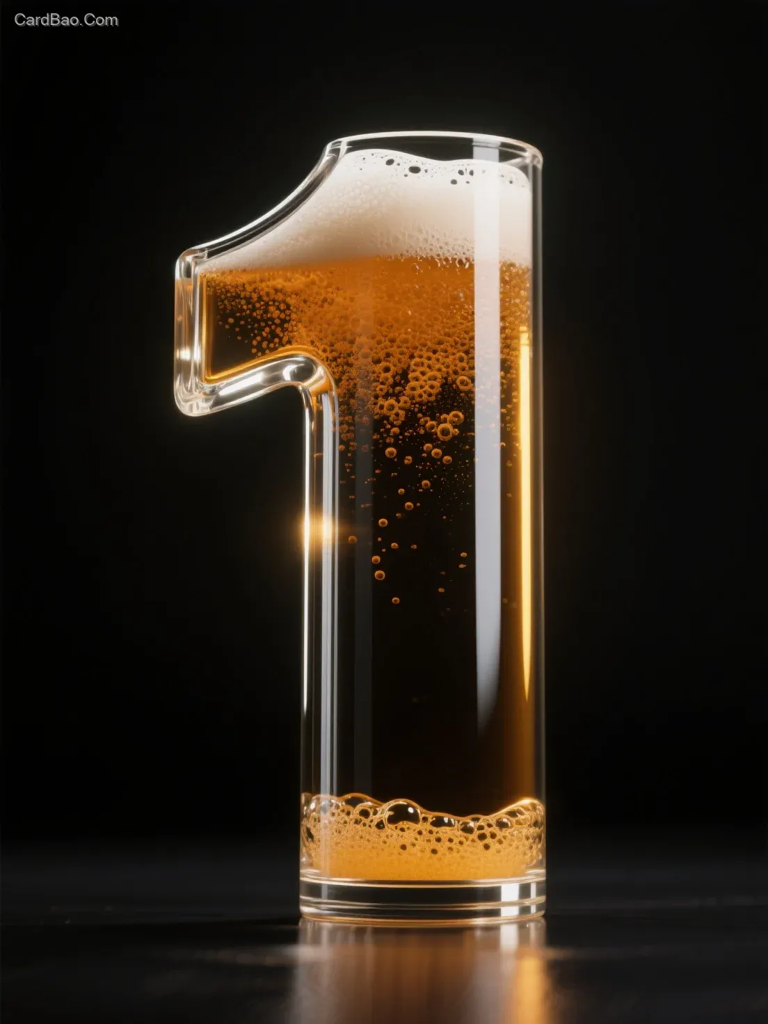 A digital "1" constructed from a cylindrical crystal glass tube perfectly holds the amber beer liquid surface, with the foam layer forming a precise horizontal cut surface with the tube mouth. A matte black background eliminates ambient light reflection interference, while a directional soft light system creates a uniform halo band on the crystal curved surface. An ultra-high-definition 8K close-up showcases the perfect meniscus formed by foam molecules on the crystal glass tube wall. UE5 real-time fluid simulation ensures the atomic-level stable state of the liquid substance inside the cylindrical container, all presented with a sterile laboratory-grade clean visual presentation.