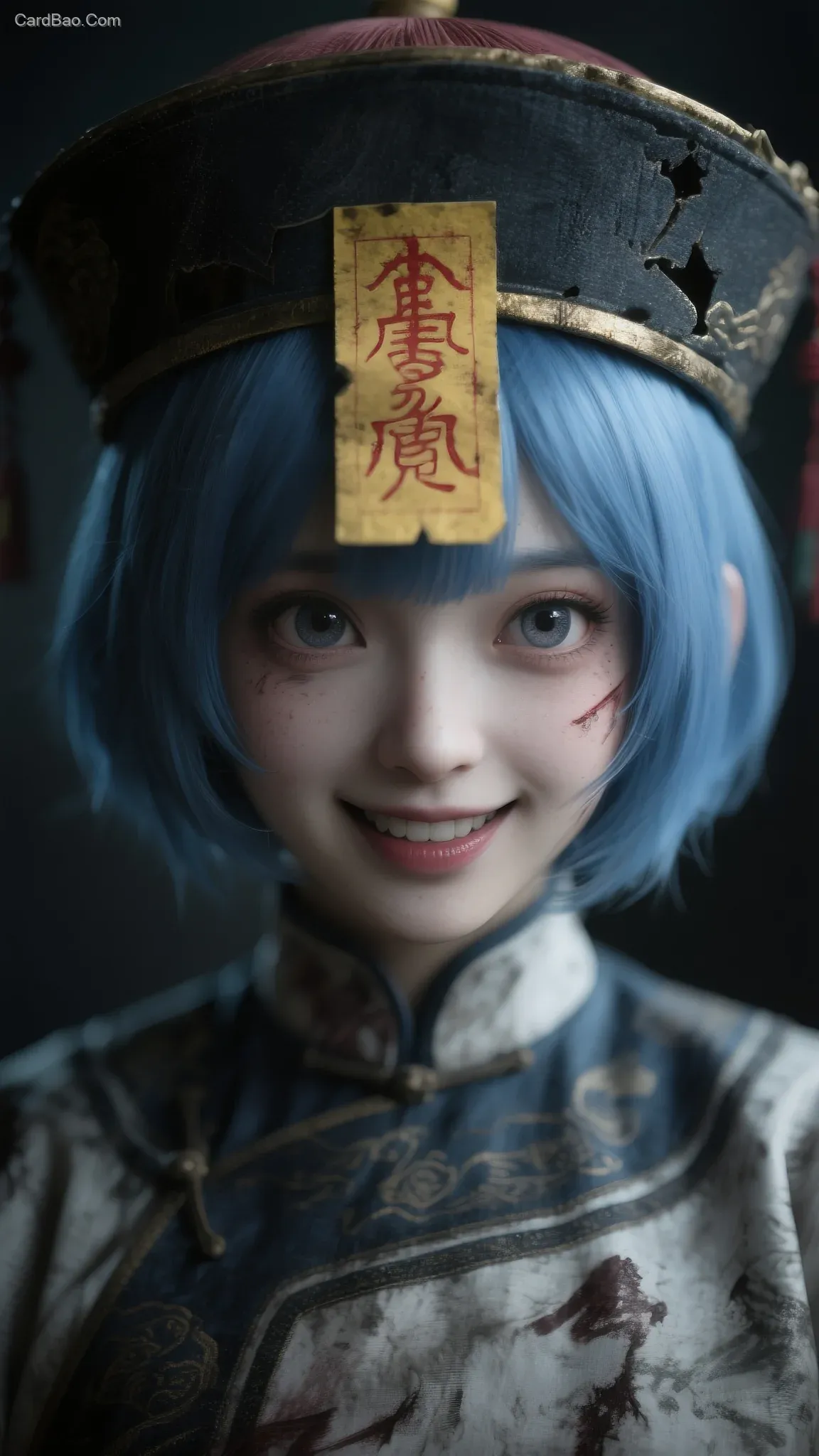 蕾姆真人模仿,藍色短髮,头戴清朝跳尸帽,身穿清朝跳尸服,一脸坏笑,瞪大眼睛,眼睛靈動,额头贴着画着朱砂符箓的長黄纸符,呈现模糊人像,凌乱美,用于潮玩艺术展示图,特写镜头,暗朦调、隐约淡彩褪色、泛朦、对焦模糊、低饱和、高噪点、胶片颗粒质感、极简风、灰度美学、写意风格,复古、迷离、紧张氛围,具有电影级画面、伦勃朗光效果、前卫视觉艺术美学和高级感,故事感强。