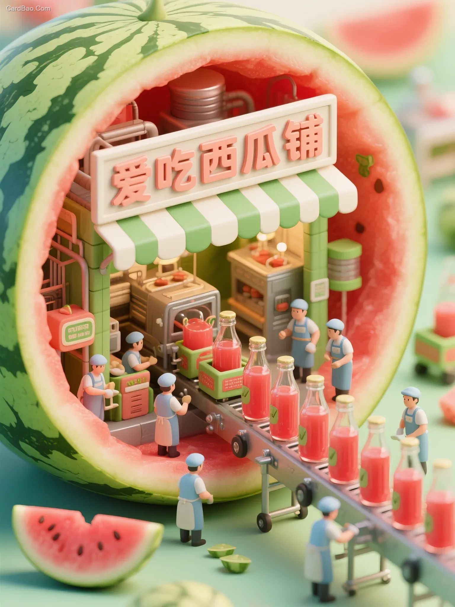 微缩景观,一个巨大的西瓜,切开一半,露出里面有一个微型工厂,上面一个招牌“爱吃西瓜铺”,工厂生产线正在生产西瓜汁,工人们正在忙碌,生产线延伸出来,源源不断的玻璃瓶西瓜汁运出,3D动漫卡通风格,色彩鲜艳,细节丰富,超细节刻画,超高画质。