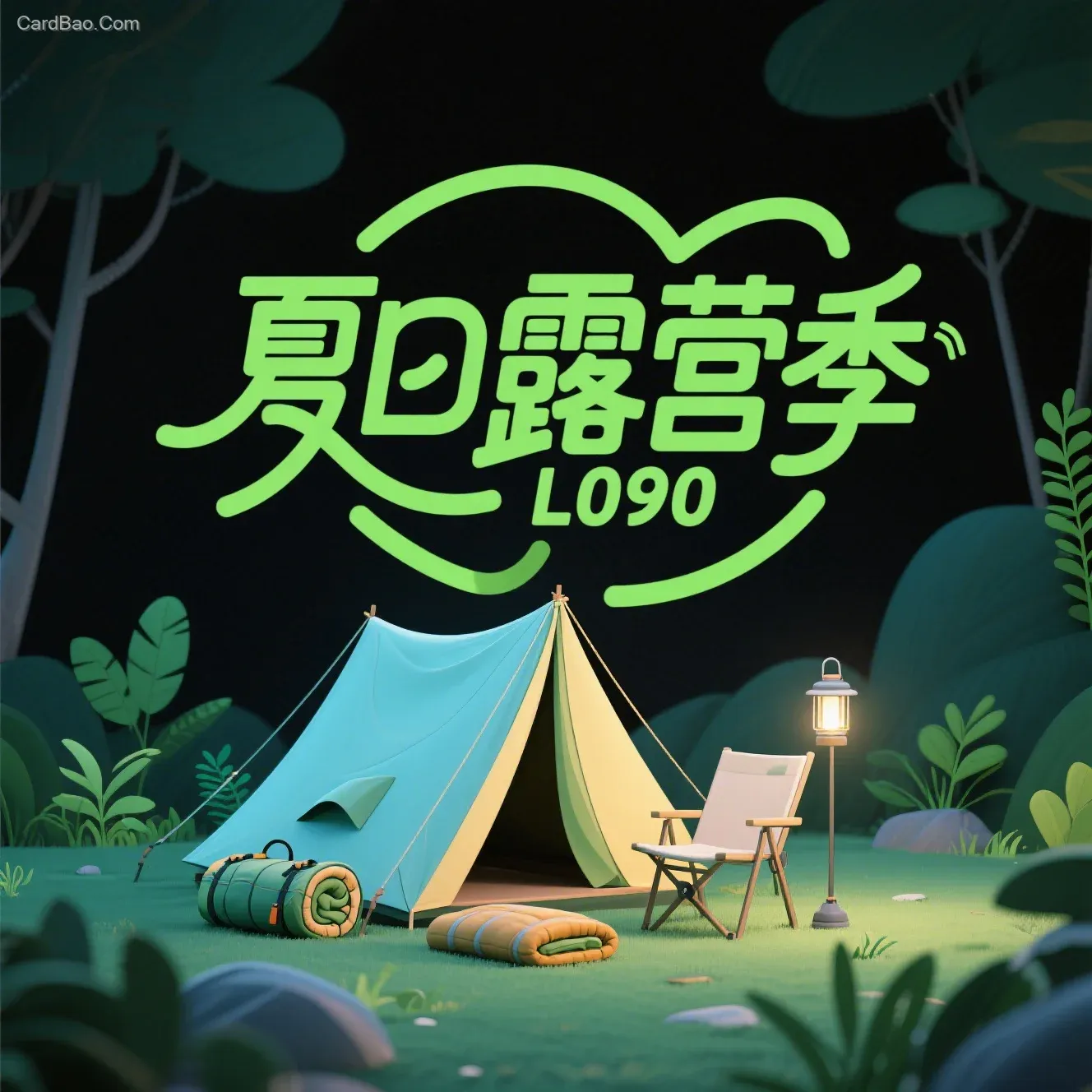 Vector illustration, logo, black background, white text, creative font design L090, smooth and artistic, Chinese characters "夏日露营季" (Summer Camping Season), green accents. Design inspiration: Abstractly deforming the font to create a strong visual impact. High-end feel, flat design, masterpiece.