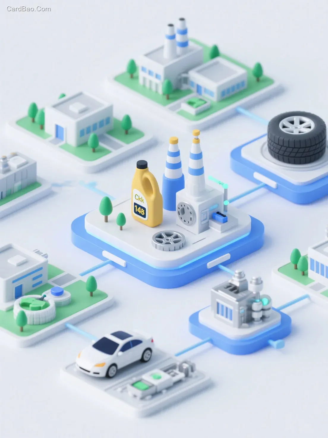 Web-style factory park icons featuring multiple parks, environmental testing, motor oil, tires, automotive parts, and other elements, symbolizing the platform's functions such as networking, park management, automotive supplies, and electronic component production. Tech-inspired style, realistic, minimalist design, 3D, C4D, rich details, studio lighting, white or light blue background, reduced excessive details, 8K resolution, 16:9 aspect ratio.