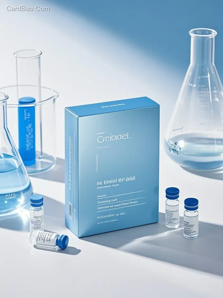 一盒蓝色面膜,直观明显,画面简洁,少量蓝色小型药妆背景,渐变蓝白色,背景是一片朦胧简约的少量小型实验玻璃器皿,通透,超强光影氛围,浅蓝色背景,医美风,使用100毫米境头,高清,整体蓝色发光