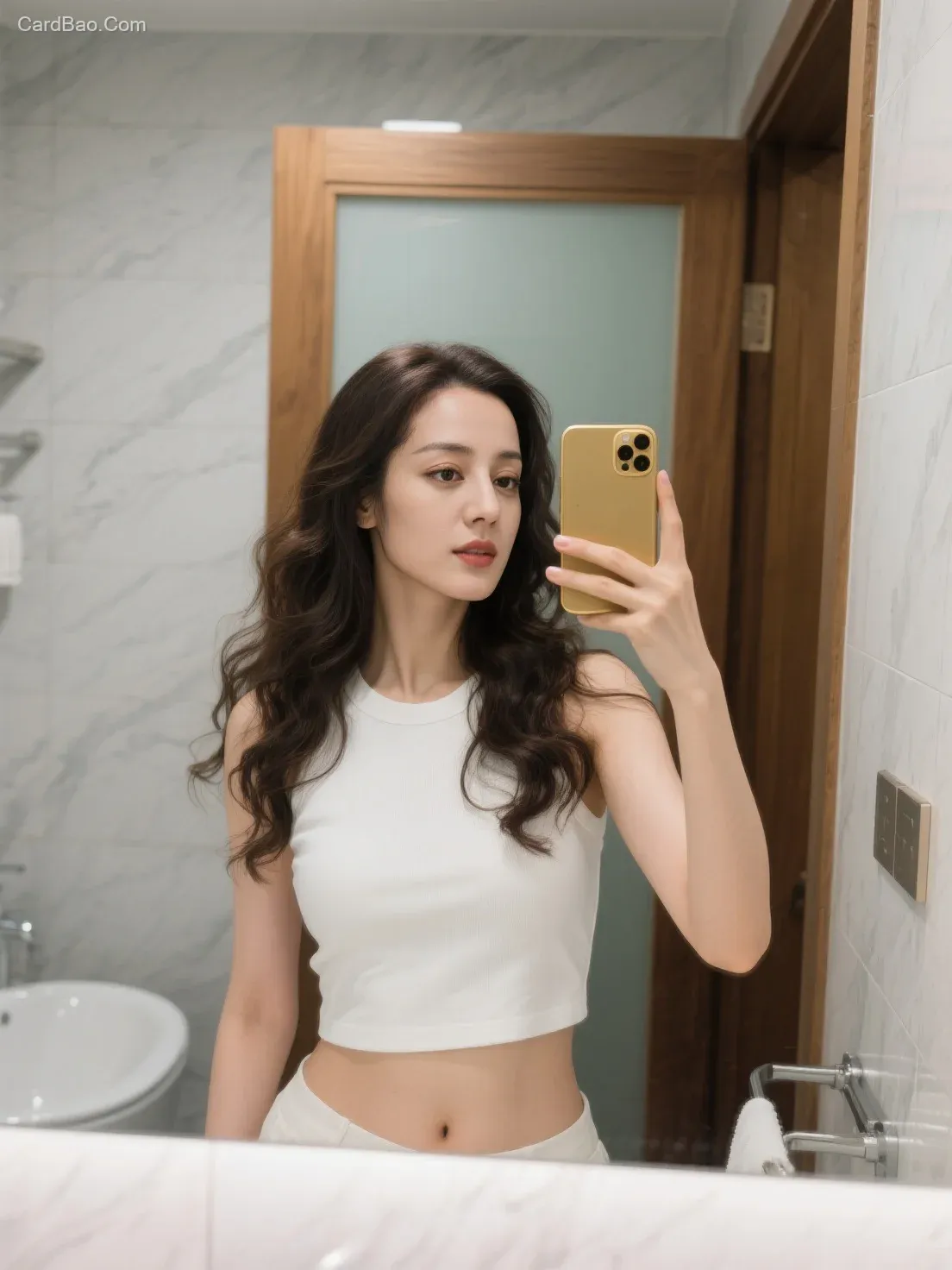 Realistic style, authentic photography, highest quality. The scene depicts a bathroom selfie setting with a background of light gray marble-textured tile walls and wooden door frames. The subject wears a white sleeveless cropped top that reveals abdominal contours, with slightly wavy long hair. Holding a gold smartphone in the right hand, posing for a mirror selfie. Emphasis on skin texture, fabric details, and hair strands, with natural lighting simulating a bathroom environment. The image is sharp and clear, with true-to-life colors, presenting a cinematic photographic quality of a daily scene, Dilraba.