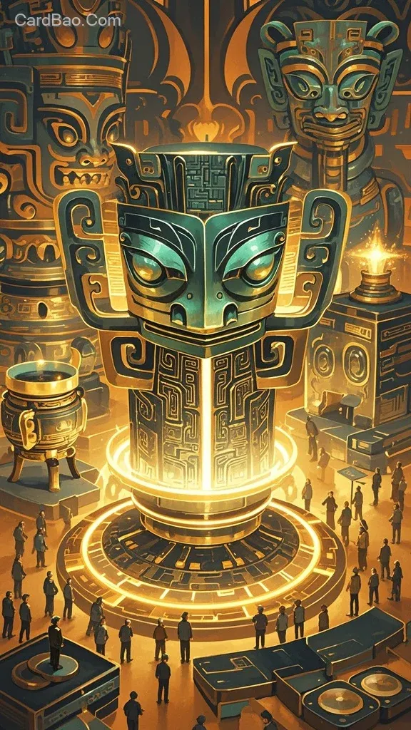 The bronze world of the Sanxingdui prehistoric civilization, where people utilize advanced bronze smelting technology and chip technology. In the center of the bronze city stands an enormous quantum computer with Sanxingdui bronze chips, adorned with taotie patterns and emitting a mysterious radiance. Science fiction illustration style, medium shot, mysterious and awe-inspiring atmosphere, with a futuristic touch, for sci-fi themed illustrations.