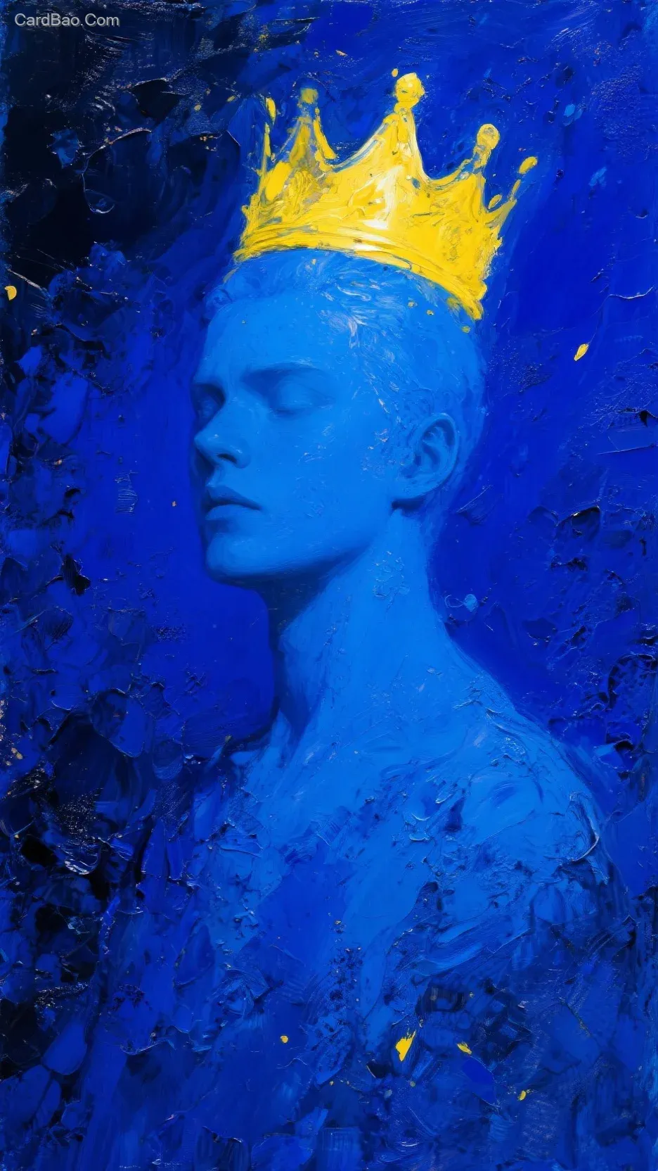动态角度,梦幻色调,颗粒,混乱,肌理感,艺术氛围感加强,暗黑,纯宝蓝色的背景 同位色宝蓝色人像,肌肤融图背景图 , 视错觉,头顶明黄王冠,罩染 曜变反射 ,光滑细腻质感丙烯油画,超现实主义美学,高级的氛围感,层次感,矛盾冲突的视觉冲击和有机融合