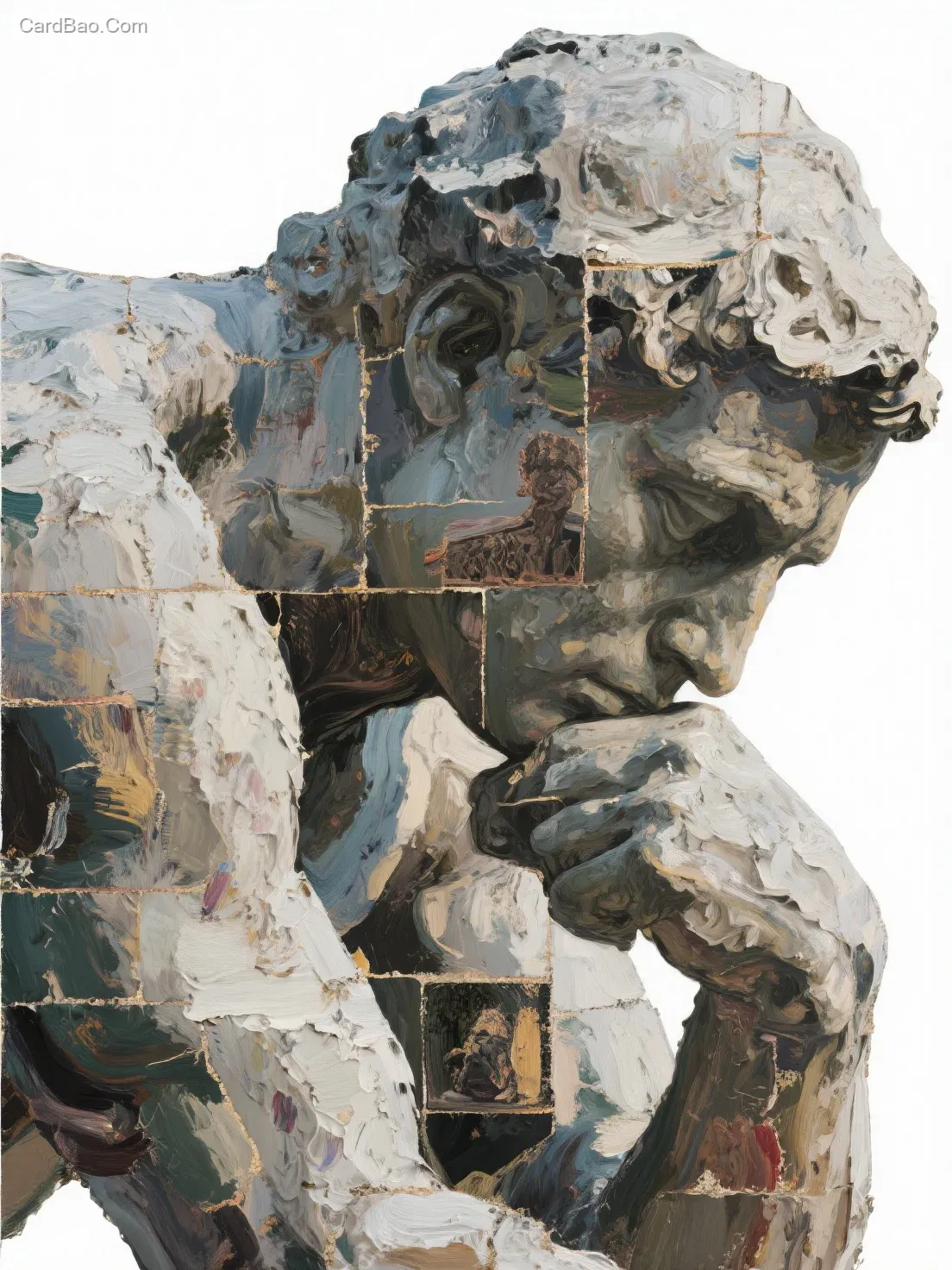 动态角度,颗粒感,肌理感,艺术氛围感加强,厚涂+晕染油画,颜料的涂抹感+肌理感,超现实主义美学,高级的氛围感,层次感,矛盾冲突的视觉冲击和有机融合。图像拼贴图像轮廓提取,拼贴风格,贴画设计,适度留白,艺术设计,罗丹思想者雕塑,故事感,