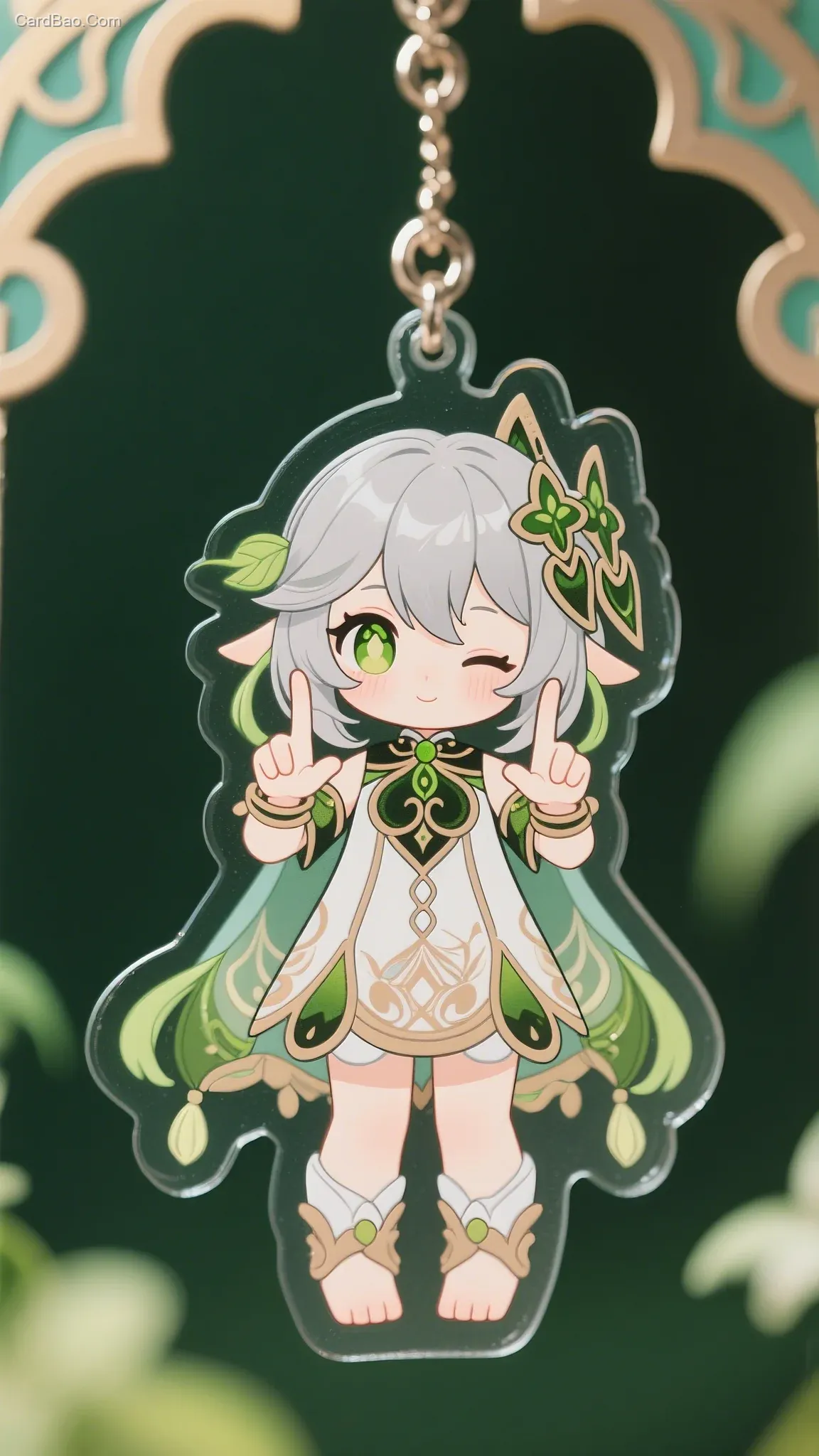 Sumeru Dendro Archon Nahida, full-body portrait, ash-gray hair, pointed chin, loli-style appearance. Hands with index fingers and thumbs joined together to form a camera gesture, acrylic keychain, fantasy-style attire, storytelling vibe, blister card accessory.