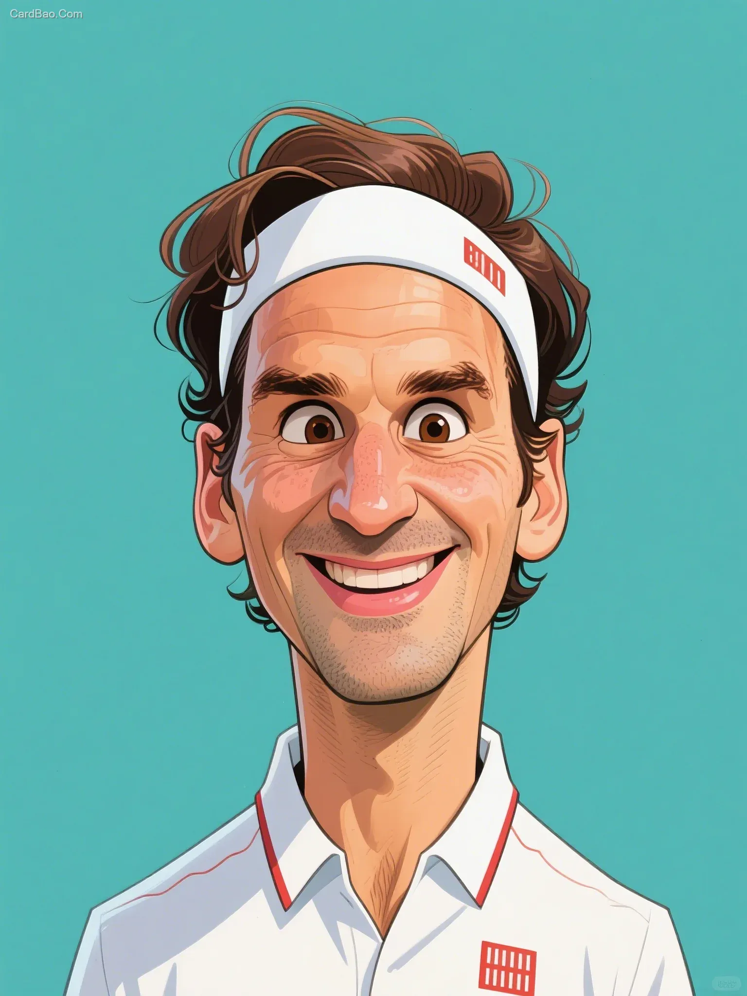 A comical and exaggerated portrait of tennis player Roger Federer, emphasizing humorous and quirky characteristics, in cartoon style with an exaggerated large head and an exaggerated playful expression. Solid color background. Ultra-high definition and detail.
