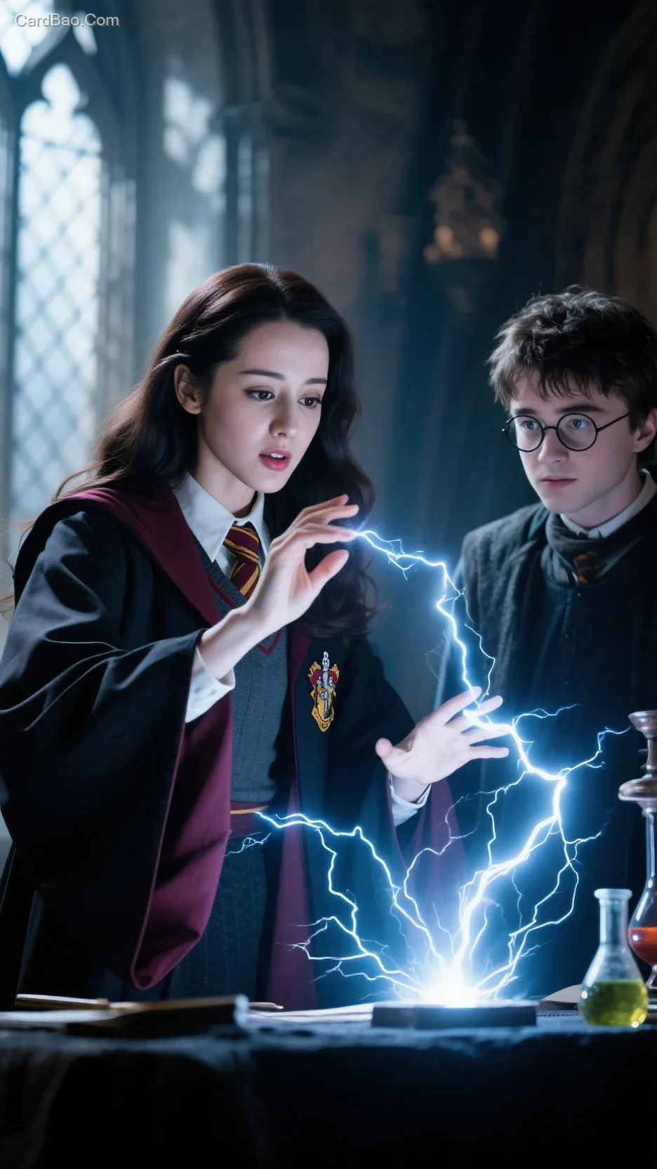 在霍格沃兹魔法学校的神秘氛围中,热巴化身学院学生,全神贯注地施展魔法,口中念念有词。她身着霍格沃兹学院的特色长袍,眼神坚定而专注。一旁的哈利·波特也在现场,微微侧身,好奇又专注学习认真地看着热巴施展炼金术。画面采用写实风格,细腻地描绘出人物的每一个表情和动作,光影交织,闪电光能,凸显出魔法的神秘魅力,营造出紧张而又充满奇幻色彩的氛围。