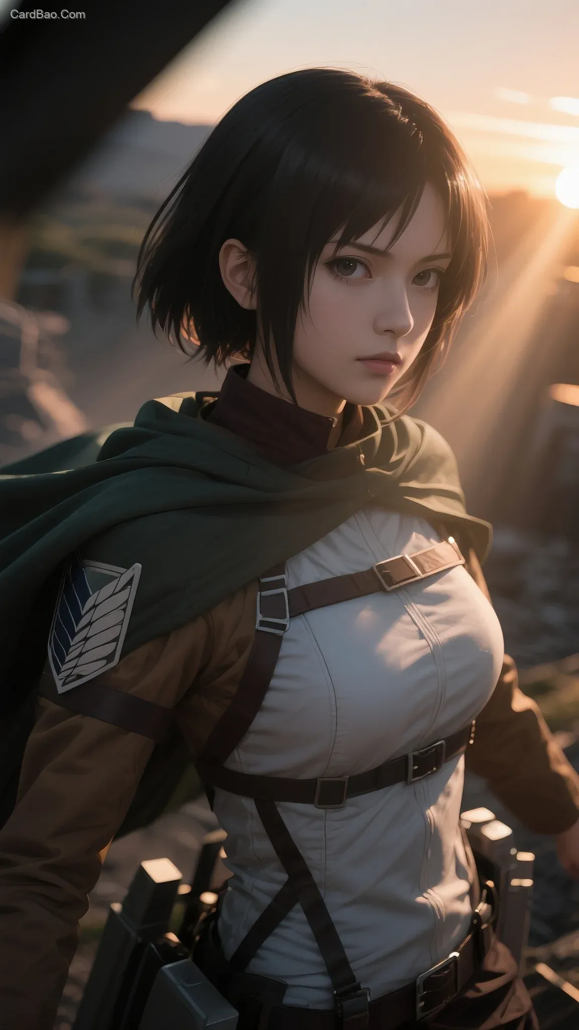 三笠·阿克曼,真人cosplay,高分辨率。渲染直出,摄影后期处理,黯淡,丁达尔效应。上半身特写镜头神圣,对角线构图高视角,俯拍镜头,动态模糊,夕阳下,气质,35焦段人像。3D虚幻,