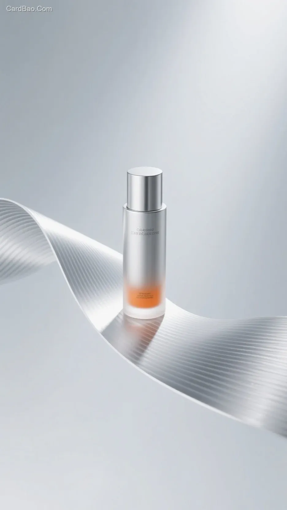 极简高级风美妆产品展示图,以银白、浅灰为主色调。中心对称构图,平视(微俯视)角度呈现品牌银色磨砂瓶身精华。产品置于银色金属波浪曲面上(带拉丝纹理,同金属质感),浅灰渐变背景(近白 - 浅灰过渡),波浪曲面悬浮于半空,光影简洁,顶光 + 侧光突出瓶身哑光磨砂、瓶盖橙色亮面,曲面反光阴影自然,营造清冷现代、高端科技氛围