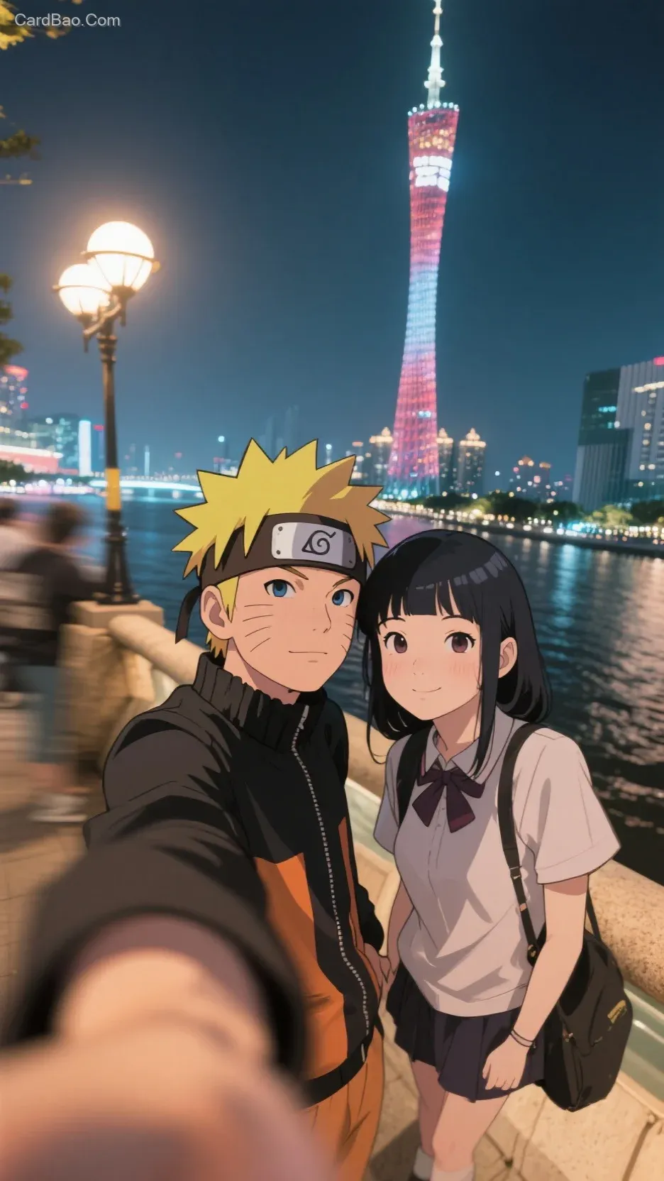 Please draw an extremely ordinary and unremarkable iPhone selfie, with no clear subject or sense of composition—just like a casually taken snapshot. The photo should have slight motion blur, uneven lighting from sunlight or indoor lights causing mild overexposure. The angle should be awkward, the composition messy, and the overall feel deliberately mediocre—as if it were accidentally taken while pulling the phone out of a pocket. The main subjects are Naruto and Hinata, at night, with the Canton Tower in the background, by the Pearl River in Guangzhou.