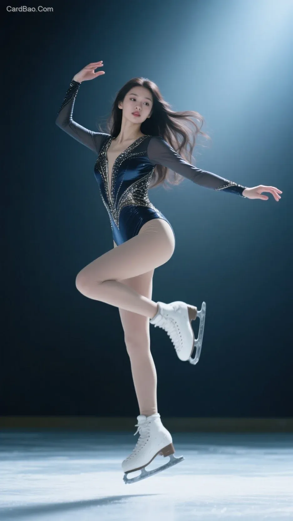 - 单脚跳跃:单脚站立,另一只脚抬起,利用站立脚的力量蹬地起跳,在空中短暂停,花样滑冰 最美运动员,一个气质温柔的长发女神,身穿高档豪华滑冰连体衣,人物近距全身照。电影质感,看见双手摆动。正面照