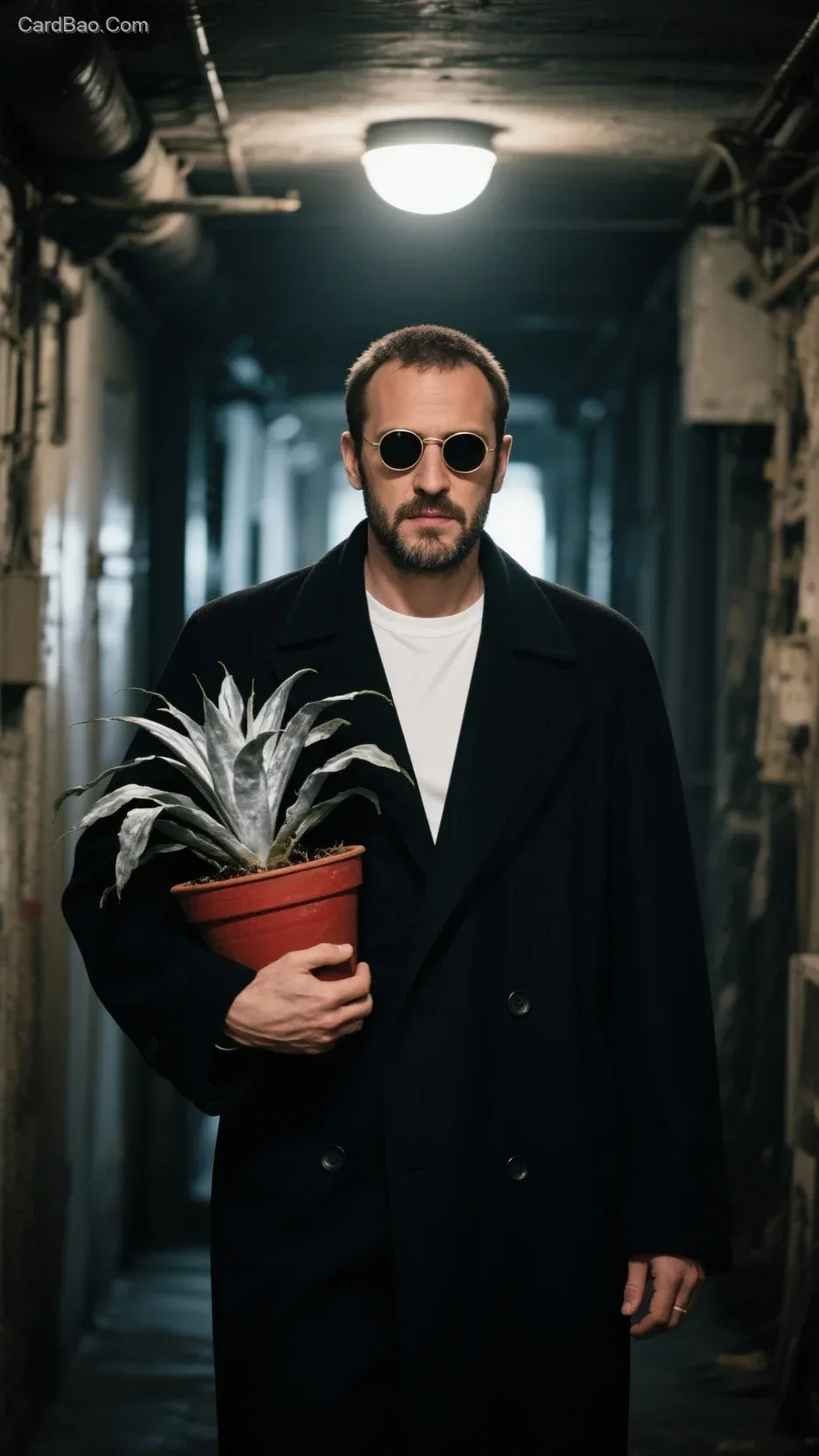 Leon: The Professional, Jean Reno's 35-year-old frontal photo, wearing a single-breasted black overcoat, a loose-fitting overcoat, a white round-neck cotton shirt, round sunglasses, very short hair, stubble, in a corridor, with a expressionless face, holding a pothos plant (Silver Queen) in his right hand, red terracotta flowerpot, dark and cluttered background, an overhead light flickering on and off, cinematic texture style, light and shadow effect, high-definition image quality, master-level photography, blurred background to highlight the subject.