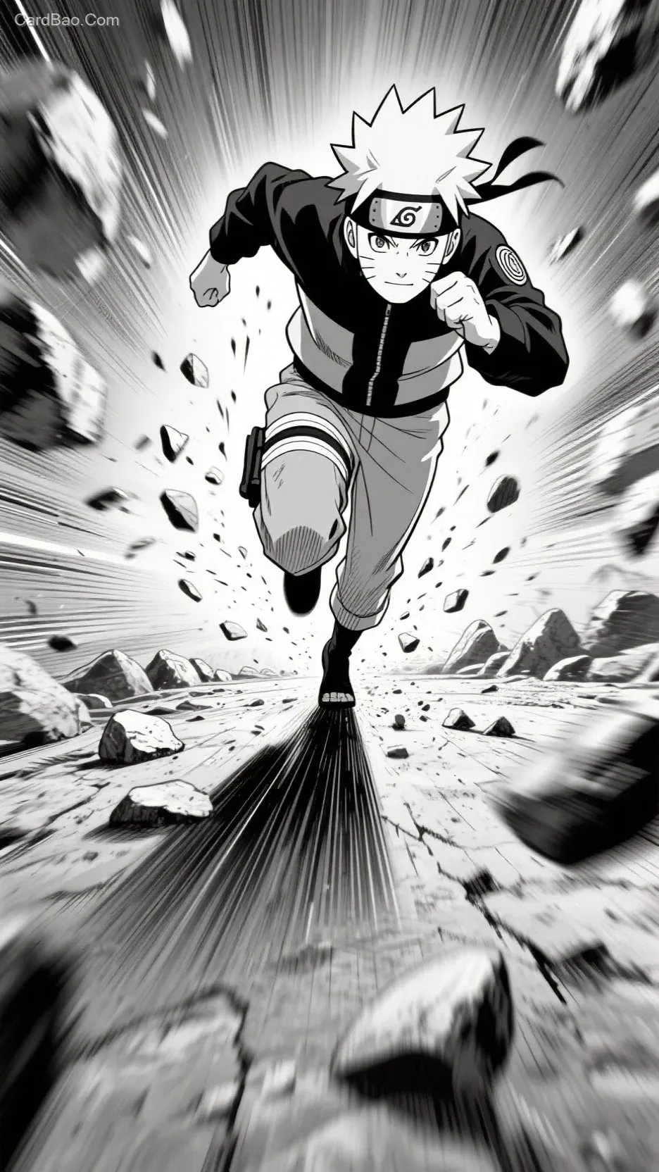 比例 「9:16」黑白战斗动漫,正确透视动态构图,火影忍者鸣人身体极度前倾奔跑,画面远端是踩碎的石块,头部最大,支撑脚中等大小,画面远点的脚最小。身体透视夸张拉成一条线,鸣人身体动作方向被动态模糊完全覆盖拉出长长的直线残影,被径向模糊完全影响出现紧贴身体的拉长平行锐角细密线条,冲击力。