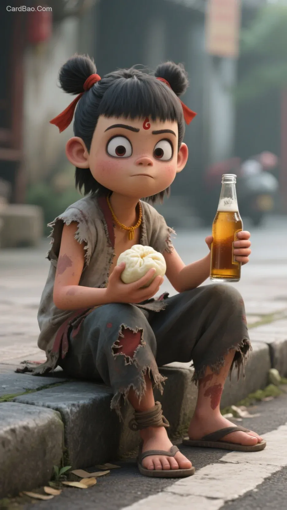 A 3D mischievous child Nezha, wearing tattered clothes, sitting by the roadside, holding a steamed bun in one hand and a beer in the other, realistic, high-definition, lifelike