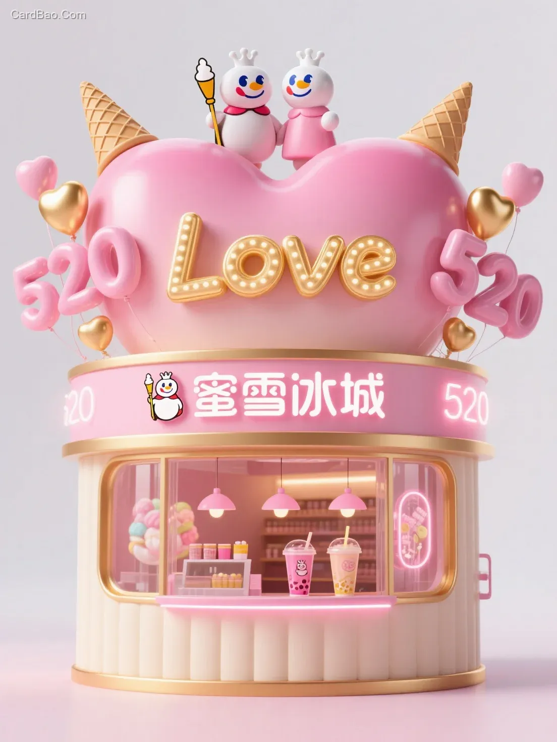 3D 迷你风格,蜜雪冰城化身为巨型爱心冰淇淋造型的浪漫店铺,顶部站立着甜蜜相拥的雪王情侣人偶,两侧延伸出冰淇淋甜筒装饰臂。整体采用浪漫樱花粉与闪耀鎏金色配色,爱心边缘渐变玫瑰粉,雪王服饰点缀珠光粉与金边。店铺正面,巨型 “蜜雪冰城” LOGO 由发光金色爱心气球串联字母构成,两侧 “520” 立体粉色气球字醒目亮眼,顶部 “Love” 金色气球标语轻盈飘动。爱心冰淇淋外壳布满细腻奶油纹理,搭配玫瑰金镶边,两层透明橱窗如糖果纸般剔透,内部陈列各种奶茶饮料等,粉色爱心吊灯垂挂而下,柜台装饰流动光带与霓虹标语,甜蜜氛围拉满,干净背景,