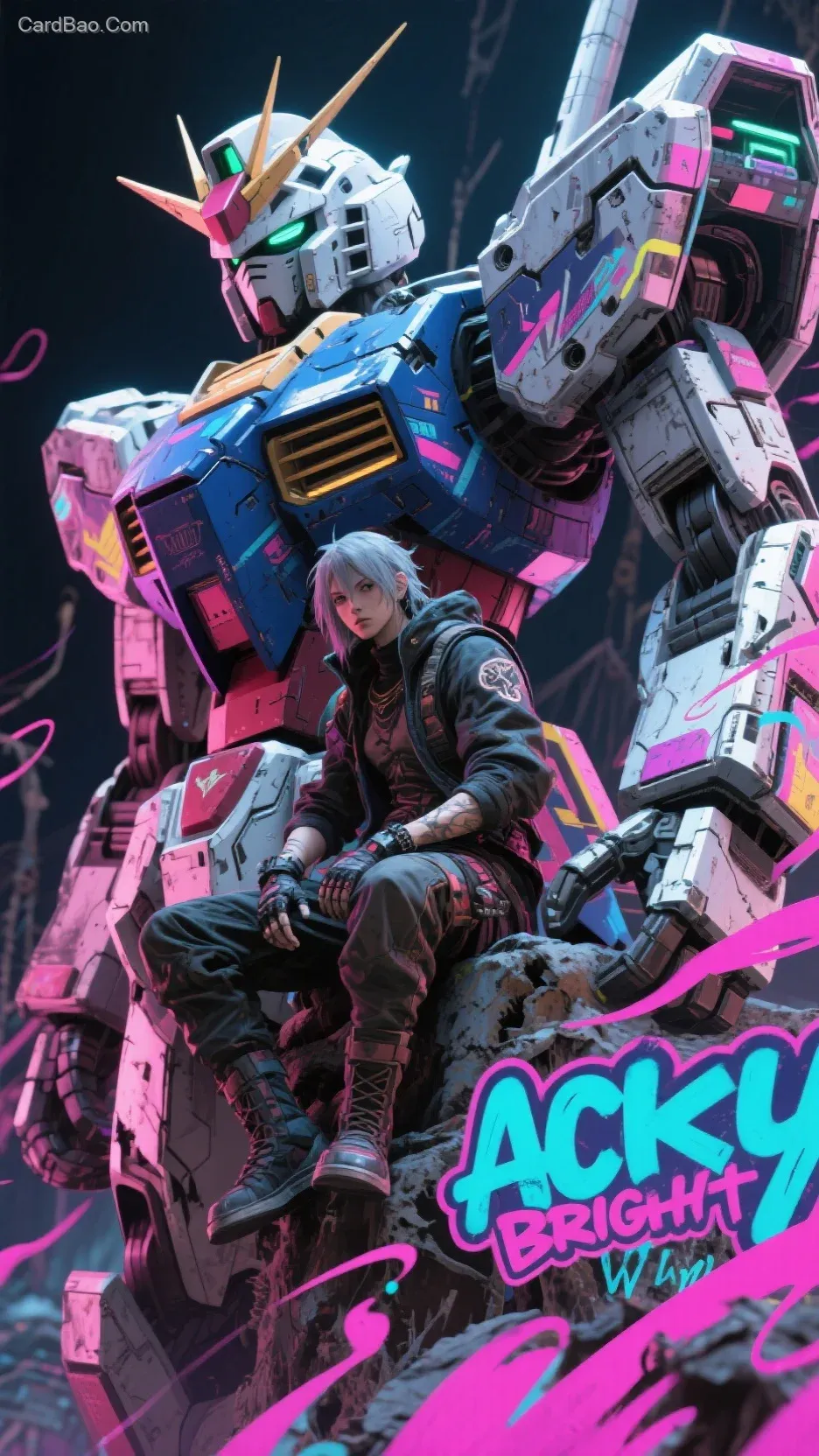 虚幻5引擎打造,Acky Bright风格,涂鸦线条飘逸装饰元素点缀。画面抽象与前卫潮流元素碰撞,天野喜孝的艺术特征,画面没有文字元素。一个穿著廢士服装坐巨大的高达seed机甲optimus prime 肩膀上
