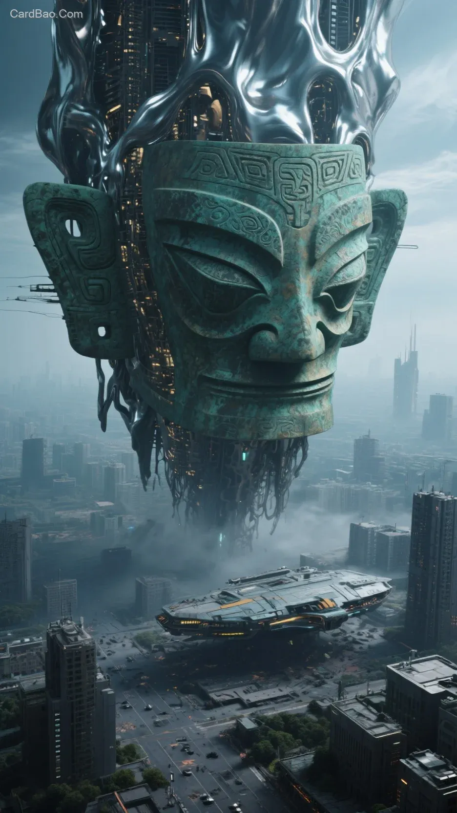 三星堆青铜面具是一个巨大的液态金属结构,青铜面具的纹理和纹样超级精致。地面的城市在地面仰望巨大的液态金属飞船,一脸惊恐,仿佛世界末日