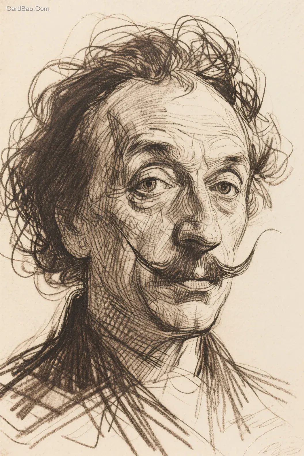 疯狂的素描,达利的肖像,一堆眼花缭乱的乱线中透露着精准的人像造型和轮廓特征,大师的风范,褐色炭精条,潦草,极度的松弛感,