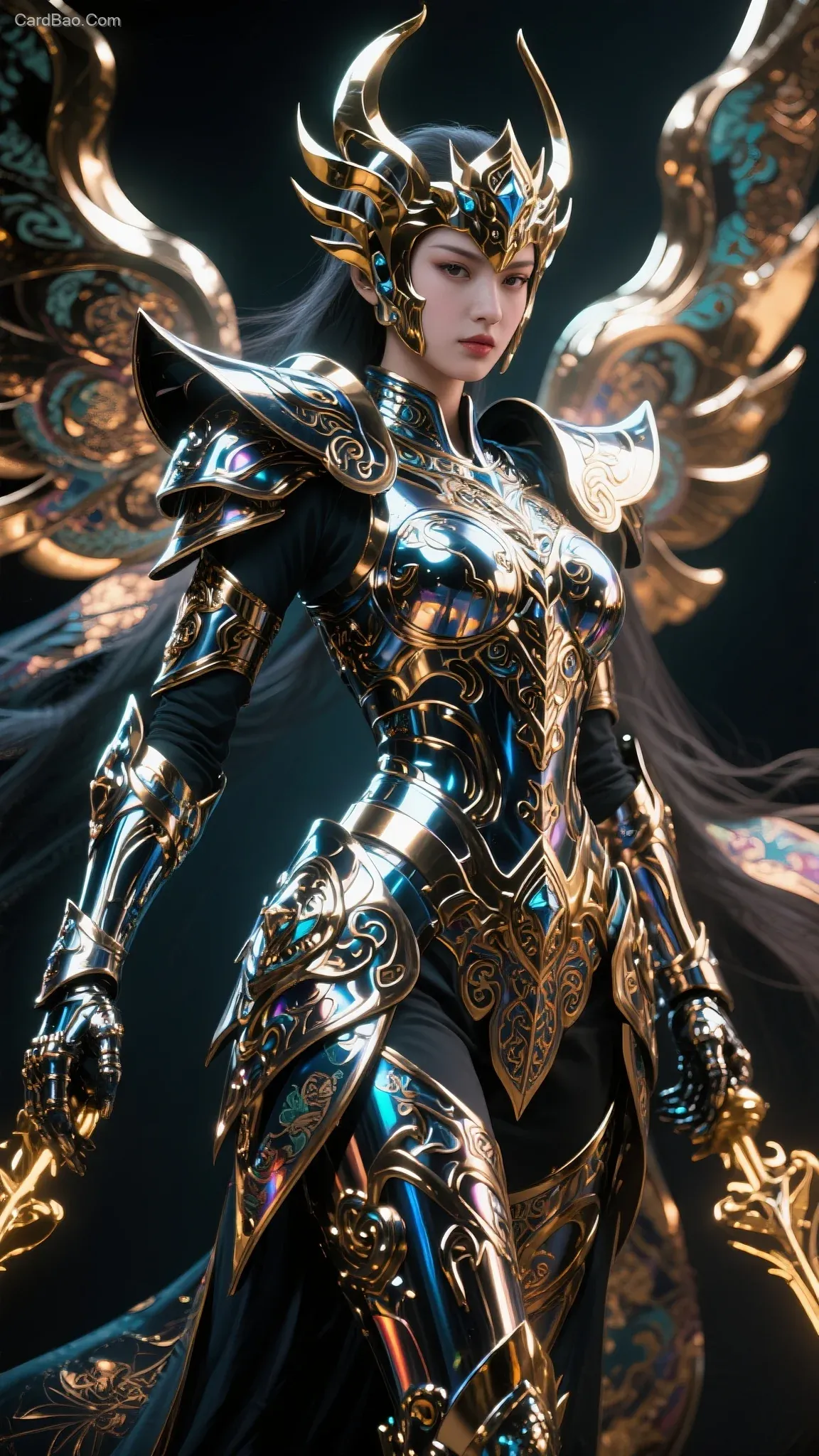 Chinese-style beauty, liquid metal armor, Athena's Sacred Cloth of the Specters attire, extremely intricate patterns and light-shadow effects. 1000000000K ultra HD.