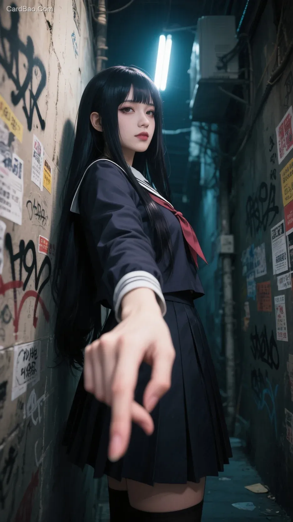 美女,深色长发,富江发型,穿JK制服,cg厚涂,国风动漫造型,真人,居高临下地看向镜头微勾唇角,背景是满是涂鸦和贴满了小广告的小巷子,昏暗,人物背靠墙壁,居高临下地看向镜头,御姐,头顶有一束光落下,发丝细腻富有光泽,一直手伸向前方,对着视线方向回勾勾手指,仿佛想要让人过来