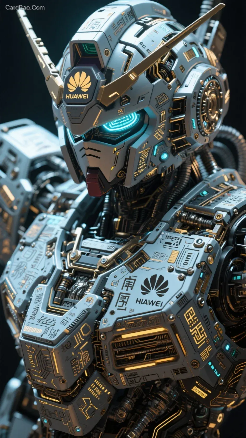 HUAWEI industrial design, HUAWEI logo water decal, Gundam hyperrealism, lifelike expression, Gundam facial features, masterpiece, upper body, close-up perspective, mecha with numerous facets, rich metal details. Countless small metal parts are inlaid on all facets of the mecha, with many Gundam water decals attached; each facet is covered with exquisite runes and circuit patterns, presenting an astonishingly complex mechanical structure. Futuristic sci-fi style, electrified feel, rich and gorgeous mechanical part details on the mecha, extremely intricate. Highly realistic, mechanical style, high definition, vibrant colors, hyperrealistic photograph, robot, 8K resolution.