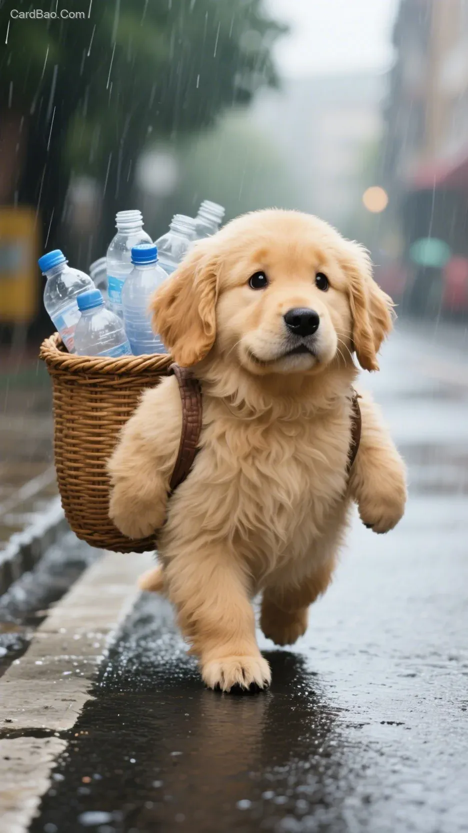 全景,全身,一只毛色金黄,矮矮胖胖的拟人化金毛犬宝宝背着一个箩筐,里面都是空的塑料瓶子,走在下雨天的马路上