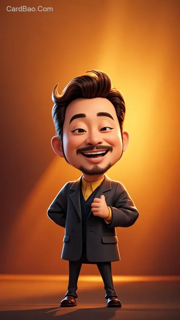 中国演员沙溢的卡通图像,抽象,夸张,高清细节,橙色背景。迪士尼梦工厂风格。 3D卡通,伦勃朗光