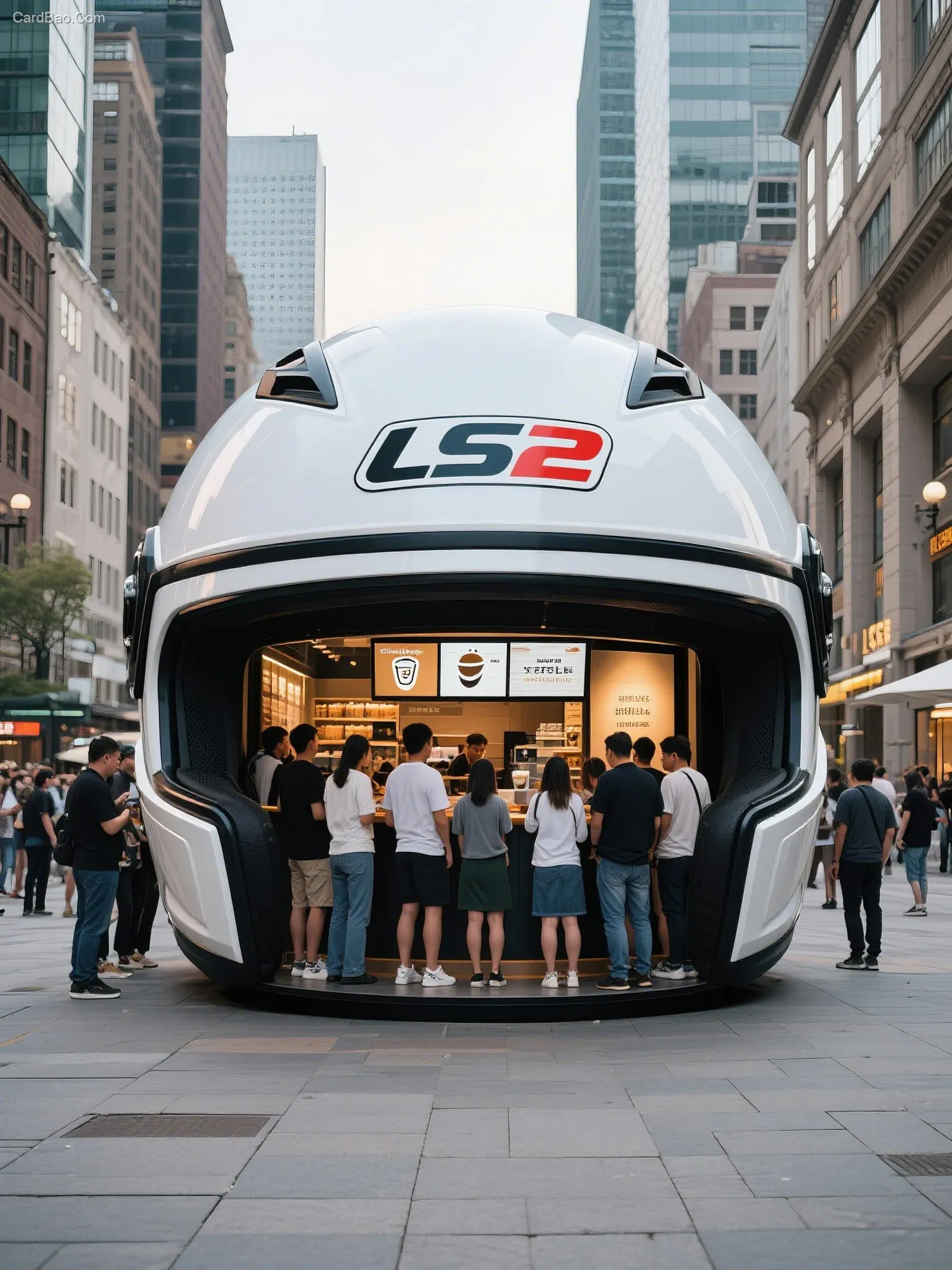 In an urban square, there is a giant helmet-shaped building. The helmet is branded LS2, inside which is a coffee shop, and a long queue has formed outside.