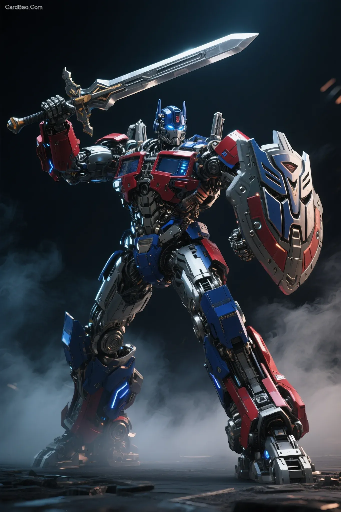 Awe-inspiring arrival! Captured in an instant by a 35mm focal length lens, (Autobot leader Optimus Prime in a full-body shot). Optimus Prime wields a cyber sword in a battle-ready slashing pose, with the other hand holding a cyber-style shield. His exaggerated, sweeping movements exude overbearing dominance, brimming with destructive power. From a front-facing portrait perspective, Optimus Prime's face becomes the absolute focal point, as if his mechanical eyes are penetrating the screen, locking eyes with the viewer's soul.