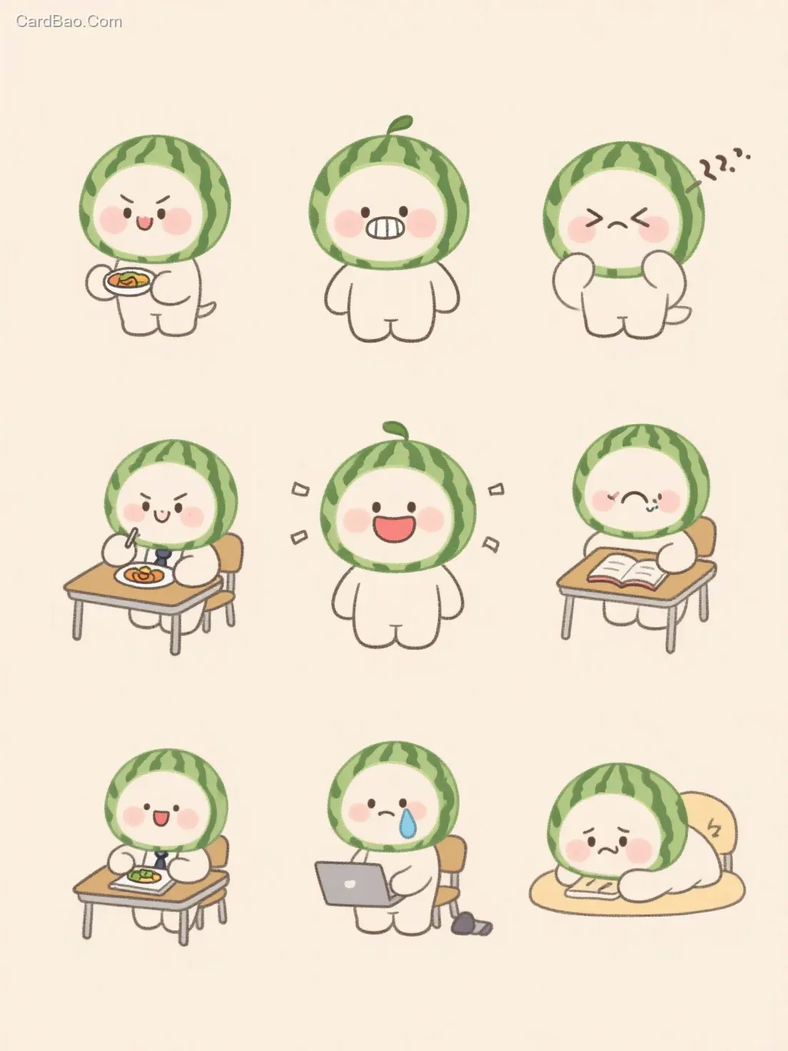 A cute IP character wearing a watermelon headgear, emoji, various expressions, angry, happy, depressed, worried, different emotions, different poses, at work, eating, in class, going to work, sleeping, studying, small daily life scenes, minimalist, hand-drawn illustration style, light color as the main tone.