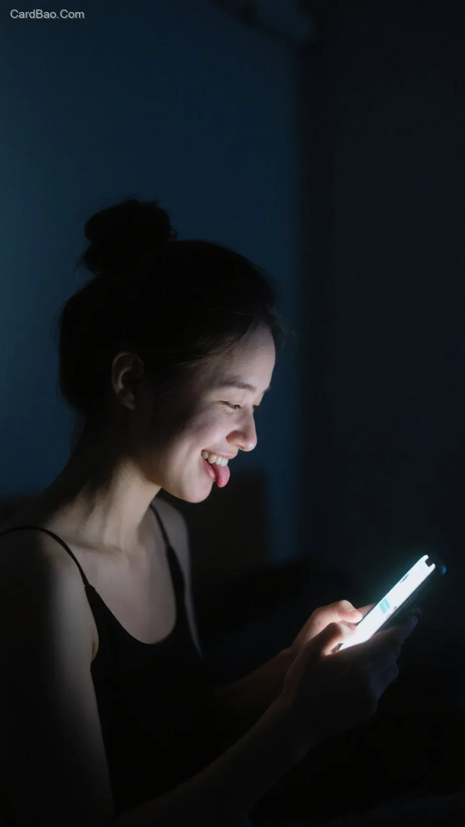 A dark room with the lights off, a woman is typing and chatting in front of the bright glow of her phone screen. Her hair is tied up, she's bare-faced, her eyes exude flirtatious charm, licking her lips, smiling.