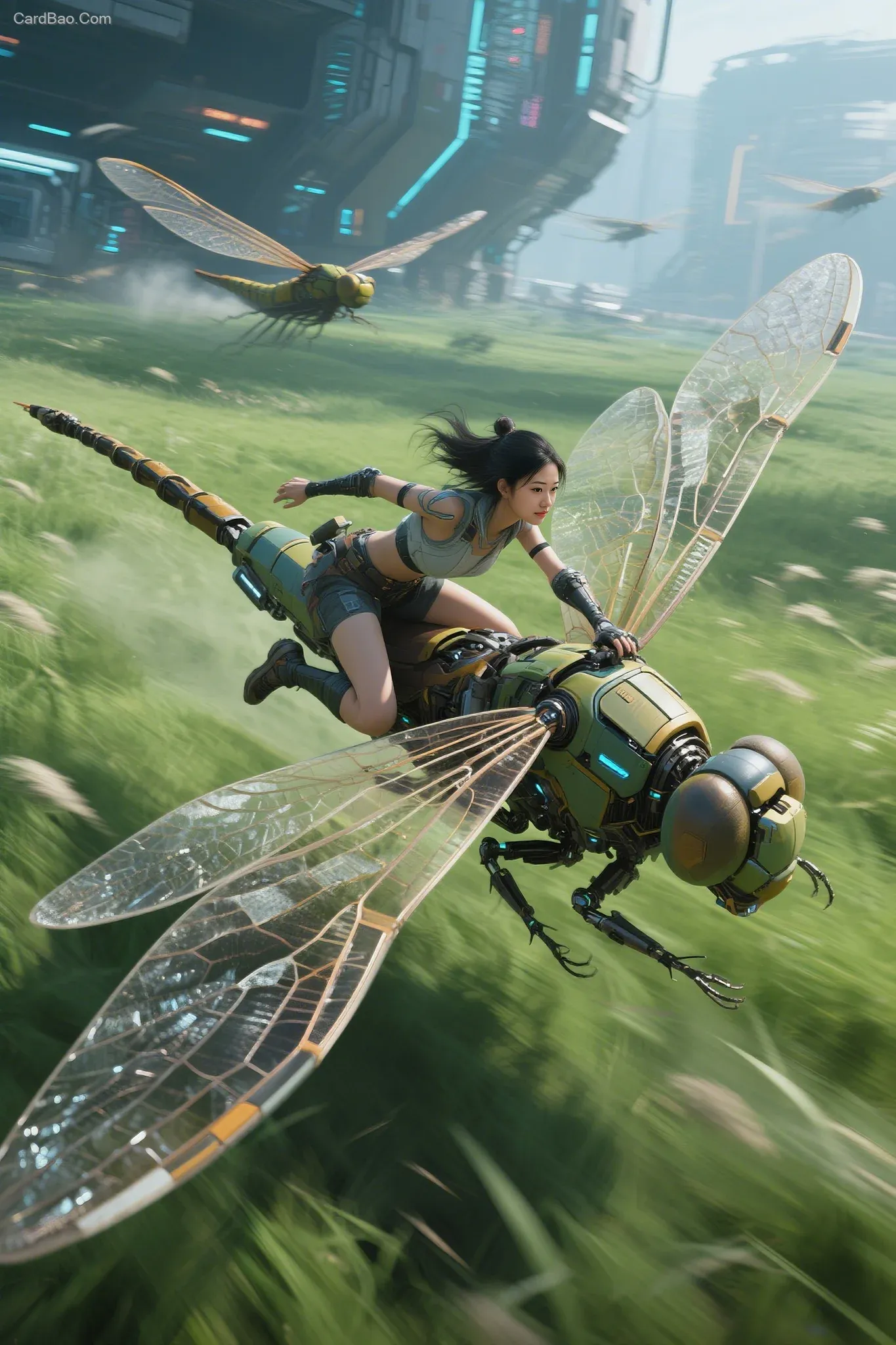 ## The future world: A sapient man riding a huge, fast-flying mechanical dragonfly. The rider sits on the dragonfly's back in a downward diving position, as the dragonfly hurtles through the grass at breakneck speed. Its massive wings stir up gusts of wind. From both downward and upward perspectives, the scene streaks past, with motion blur intensified—an art of high-speed photography, captured in sports-style footage, evoking the visuals of intense gaming competition. Cyberpunk futuristic aesthetic, HD.