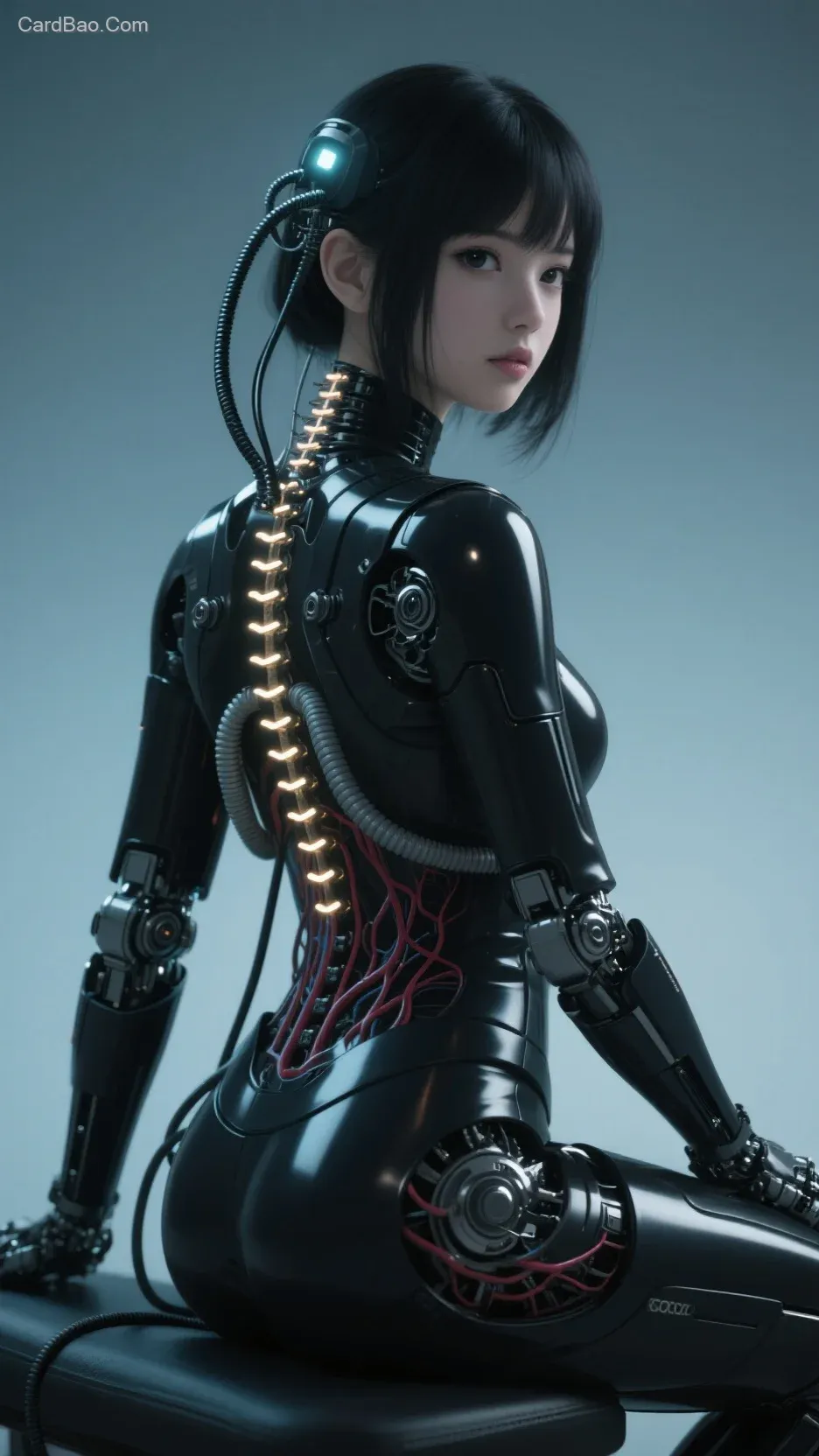 高品质, 杰作, 超高分辨率, (逼真的:1.4), 原始照片, 1 女孩, 黑发, 光泽皮肤, 1 机械女孩, (超逼真的细节)), 肖像, 全局照明, 阴影, 辛烷值渲染, 8K, 超锐利,沟暴露的原始皮肤, 金属, 复杂的装饰细节, 日本细节, 非常复杂的细节, 逼真的光线, CGSoation趋势, 黑色的眼睛, 发光的眼睛, 面对相机, 霓虹灯细节、机械肢体、连接管子的血管、背部连接的机械椎骨、颈部的机械颈椎连接、坐姿、连接头部的电线电缆、高达、小型LED灯