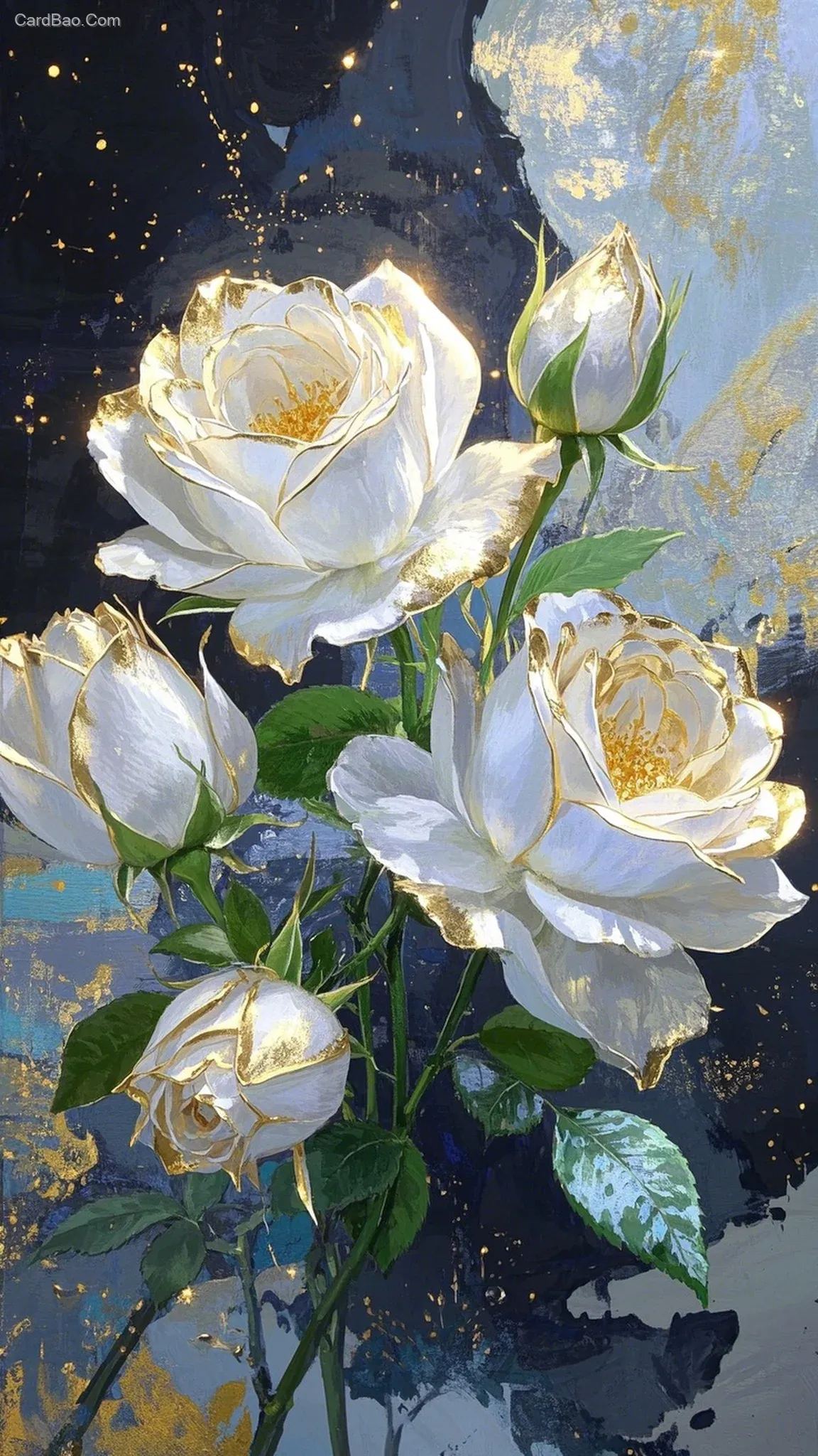 金箔岩彩画,烫金丝线,浮光跃金,绘画笔触,水墨晕染,边缘发光,高清晰度,高饱和度,光影细腻,细节处理完美,几只白色的圣斯威辛月季花,花苞,含苞待放,花瓣描金,花瓣繁复富有层次,花朵立体反射幻彩珠光,淡雅,涟漪,绿叶莹润油亮,幻光琉璃,伦勃朗光效,昏暗环境,大景深,轻度泛光,近景拍摄,特写花朵,背景浅蓝、灰、白、金泼墨流沙
